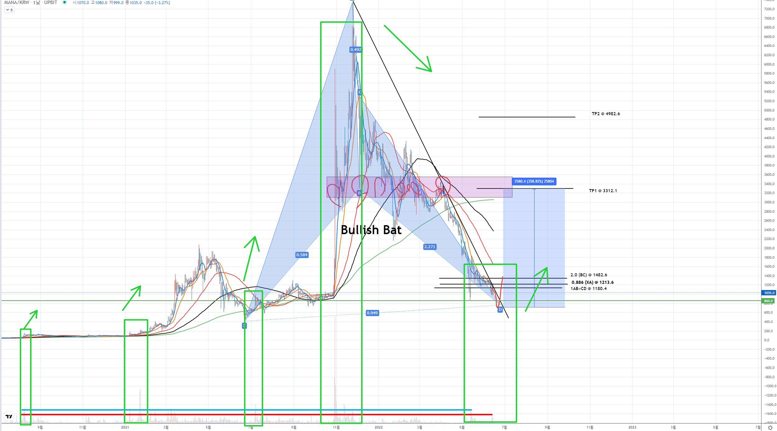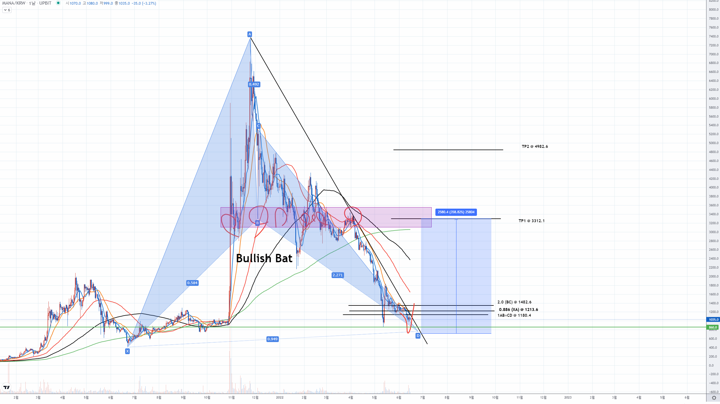 현재 빨간색 가속된 하락추세선은 상향돌파된 상태이며, 이후 초록색 화살표 흐름대로 나오며 보다 완만한 빨간색 하락추세선을 상향돌파한다면 주황색 매물대까지의 상승이 가능해보입니다. 이곳이 Bullish Bat Pattern의 TP1이죠.