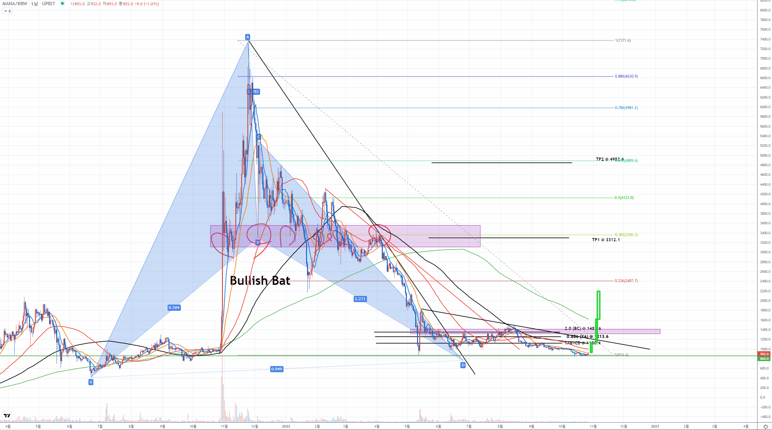 마나코인이 저점을 빠르게 갱신하지 않고 오랜기간 횡보하였습니다. 아직 패턴은 유효하며, 22년 5월 15일부터 생성된 하락추세선과 우측 하단에 있는 보라색 수평매물대를 상향돌파할 경우 강한 매수세가 붙을 것 같네요.