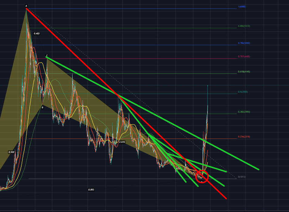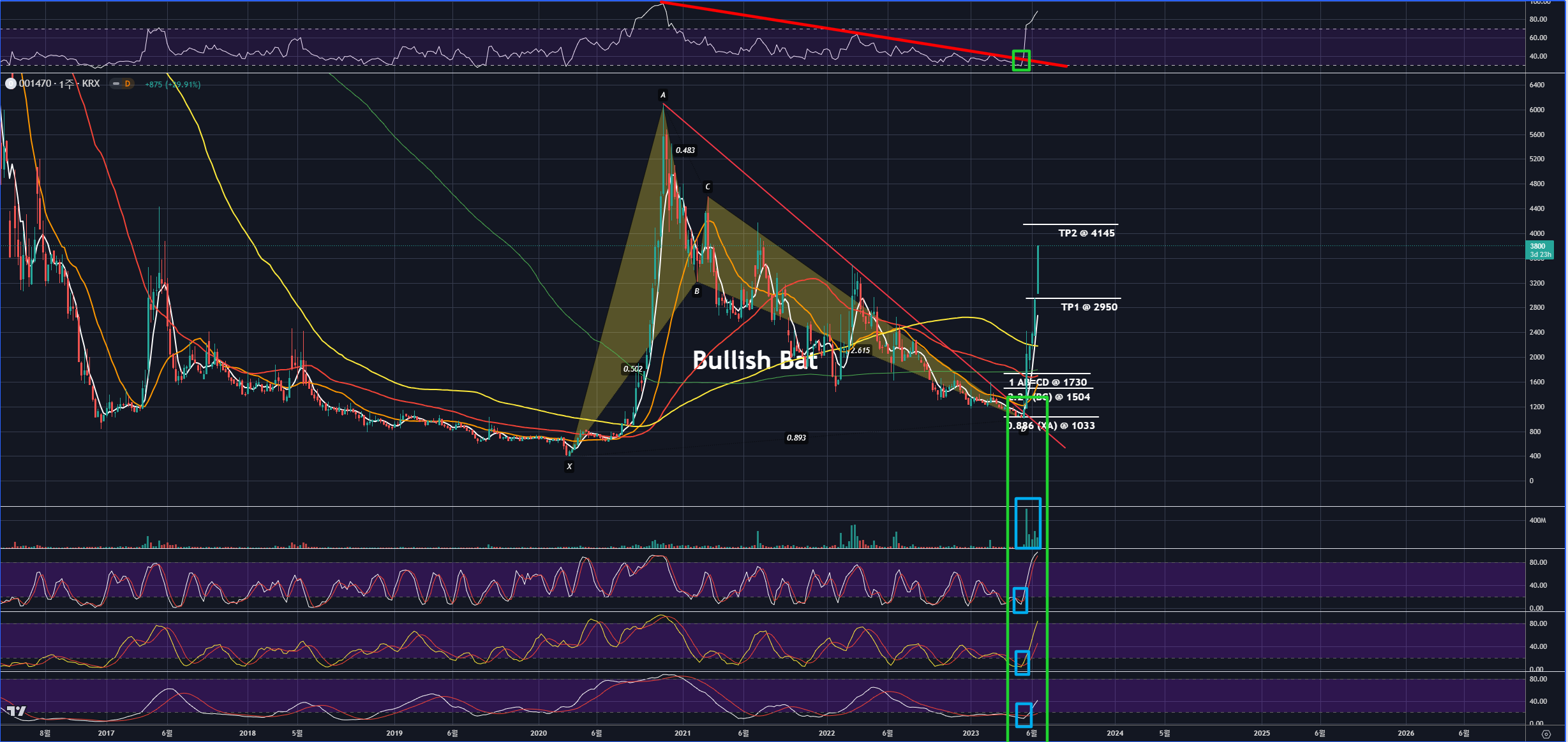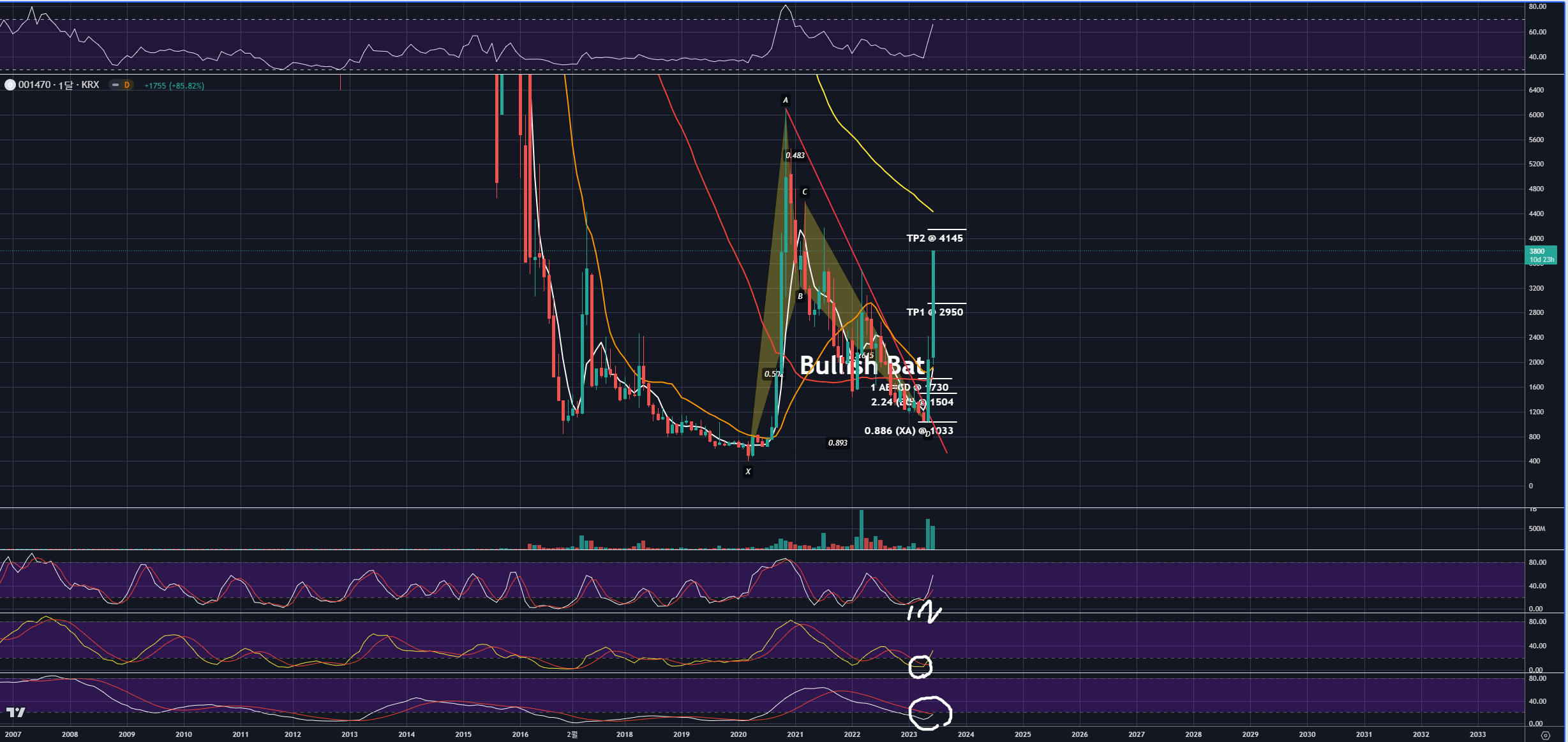 또한 20이평은 이미 60이평 위에 있고요. 이평선으로 본다면 월봉상 노란색 120이평 정도에 강한 수평매물대가 존재하므로 이 곳에서 큰 저항이 예상되네요. 이 월봉 120이평은 저항시기에 Bullish Bat의 TP2 근처가 될 것같네요.