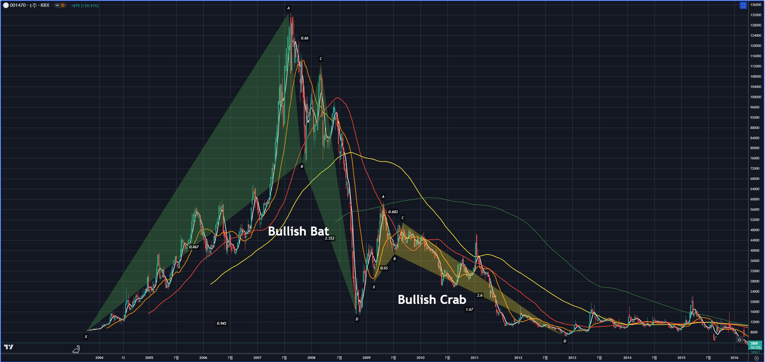 위 월봉차트 03년 10월~08년 11월에 형성된 녹색 Bullish Bat, 09년 2월~12년 11월에 나온 노란색 Bullish Crab도 강력하게 나왔었네요.