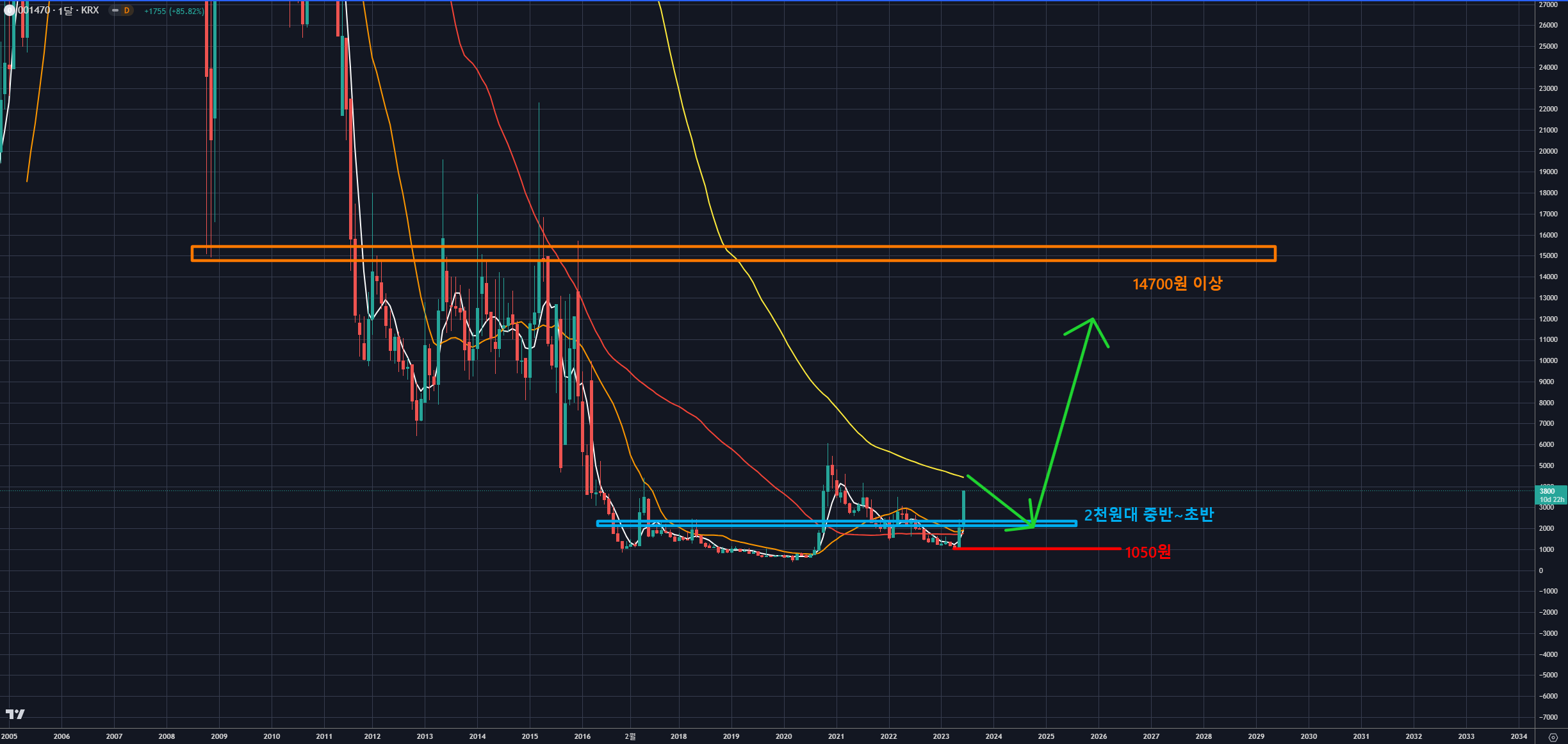 매우 큰 스윙투자를 한다면 2천원 중반정도 오면 살 준비를 하다가, 상승 전환근거가 일봉 이하에서 갖춰지면 모아가는 것이 어떨까싶네요. 손절은 1050원인 전저점으로 하고, 익절은 이전 중요한 수평매물대인 14700이상에서 하면 좋을 것 같습니다.