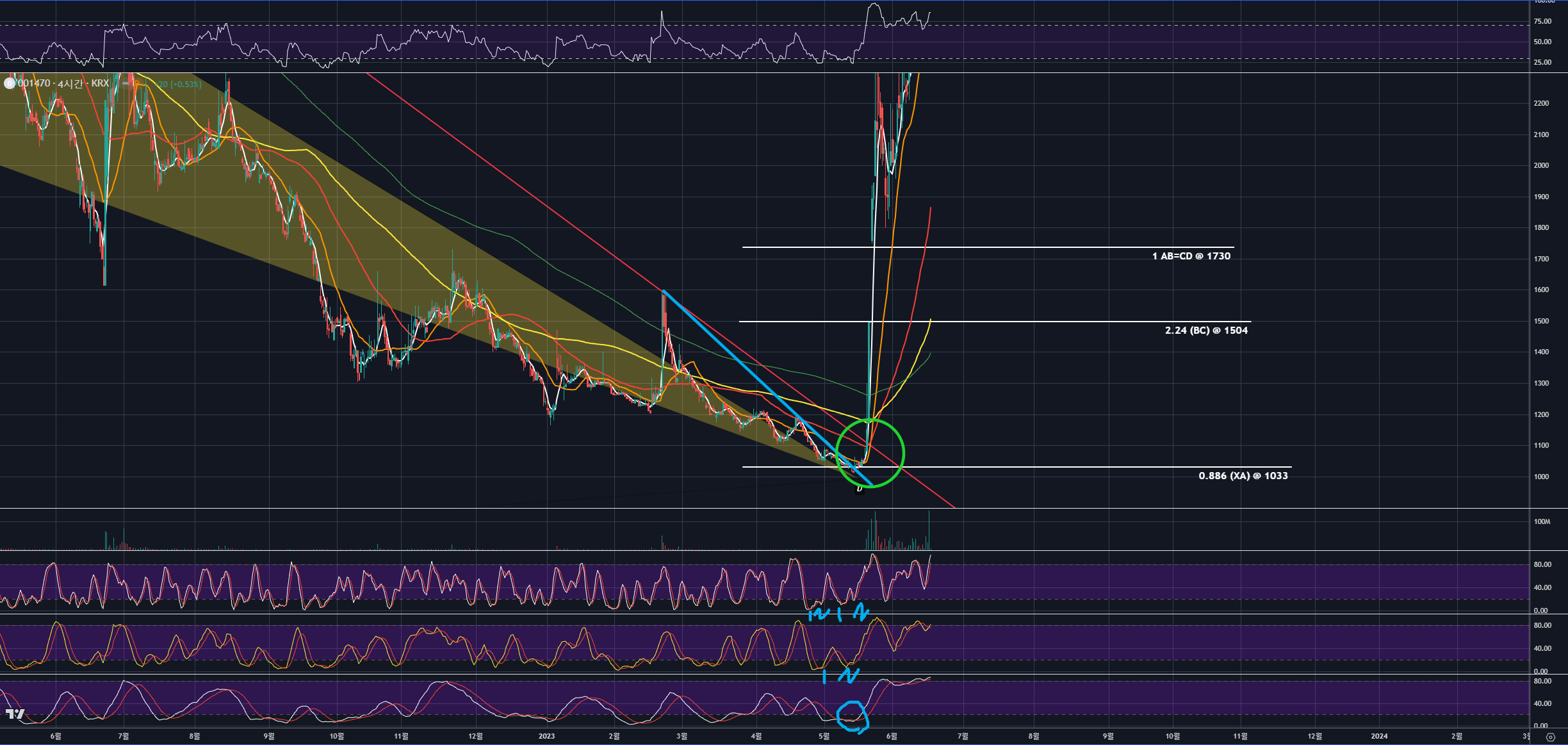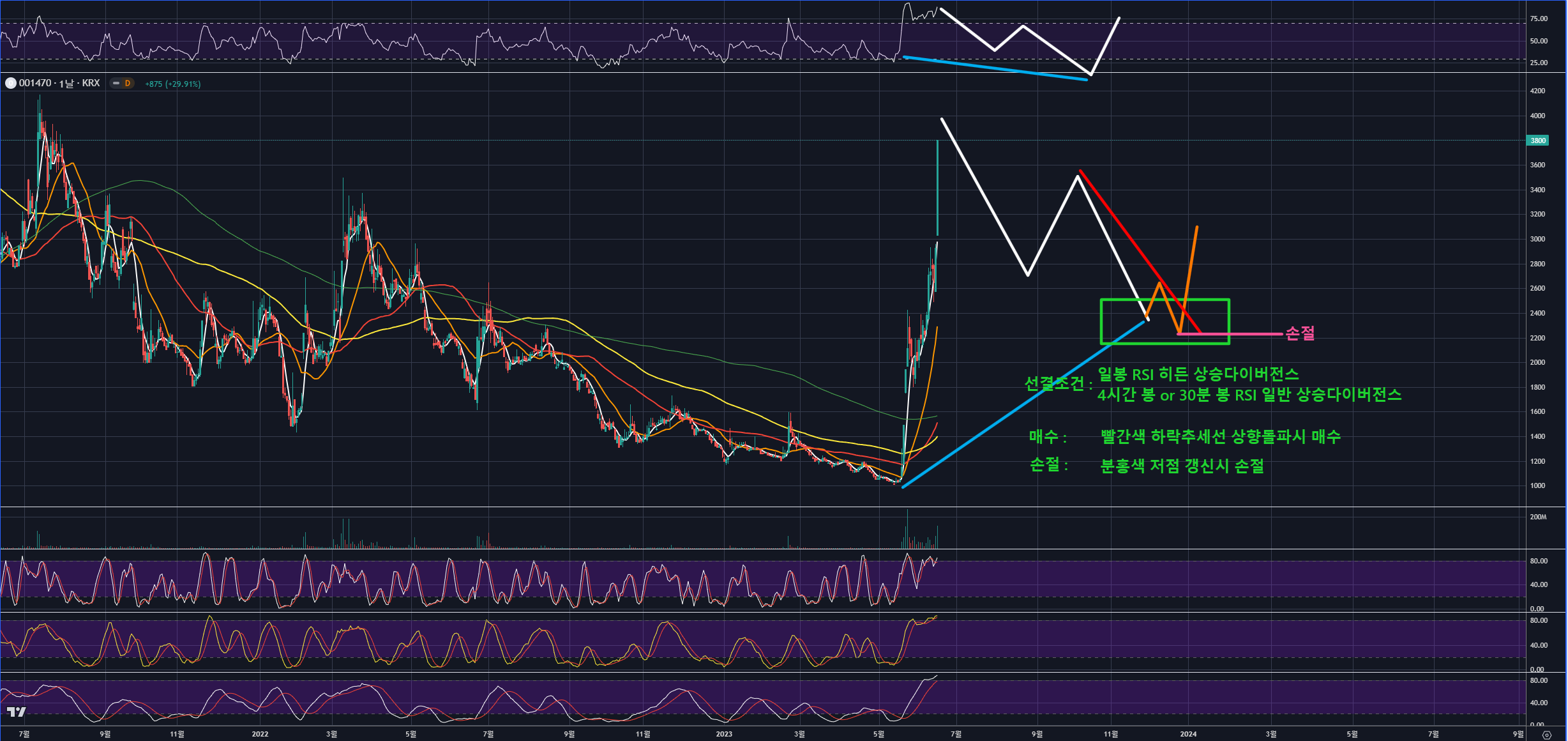 주봉을 보더라도, 빨간색 하락추세선을 상향돌파할 당시 모든 스토캐스틱이 과매도권에서 우상향으로 바뀌었으며, 거래량이 증가하였습니다. 주봉 RSI에 있는 하락추세선도 상향돌파한 후 강한 매수세가 붙은 상태입니다. 주봉급에서 RSI 과매수에 진입했기에 이 종목은 이제는 눌림목이 나오기 전까지는 신규진입은 어려워보입니다.