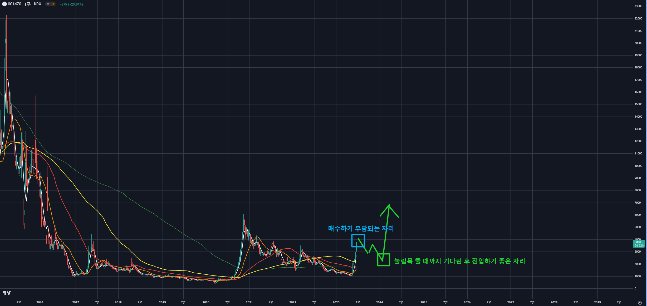 이것 또한 손익비가 매우 큰 자리이나, 실질적으로 저렇게 매매하면 2천원 대 진입해서 1050원 손절로 매우 큰 손실이 발생합니다.