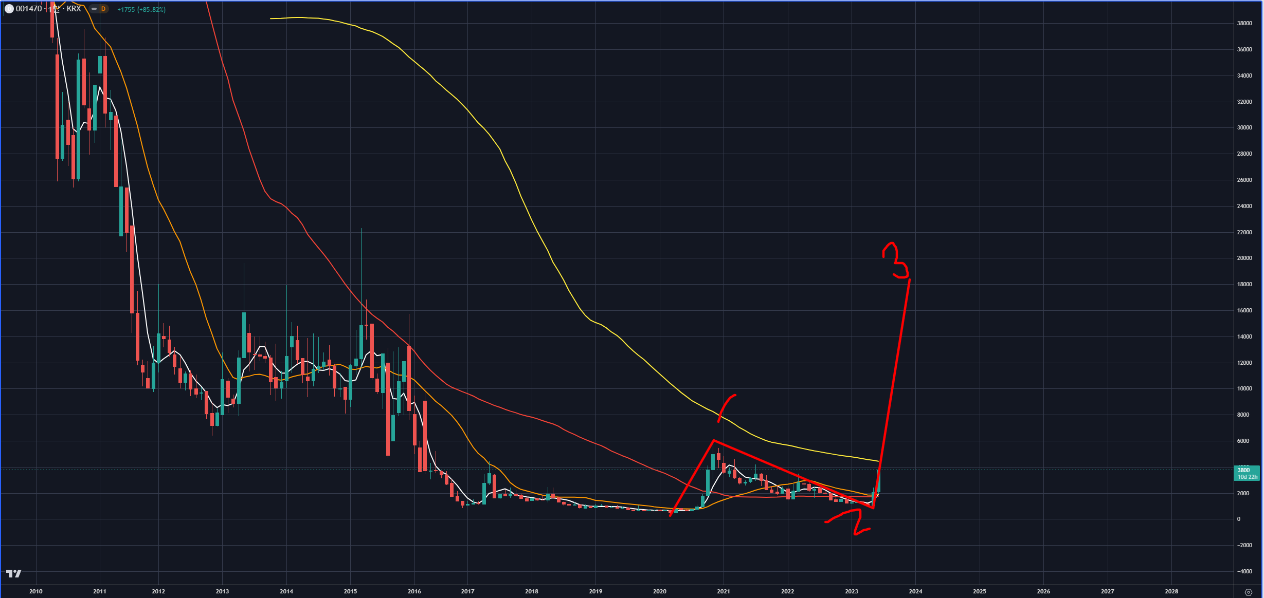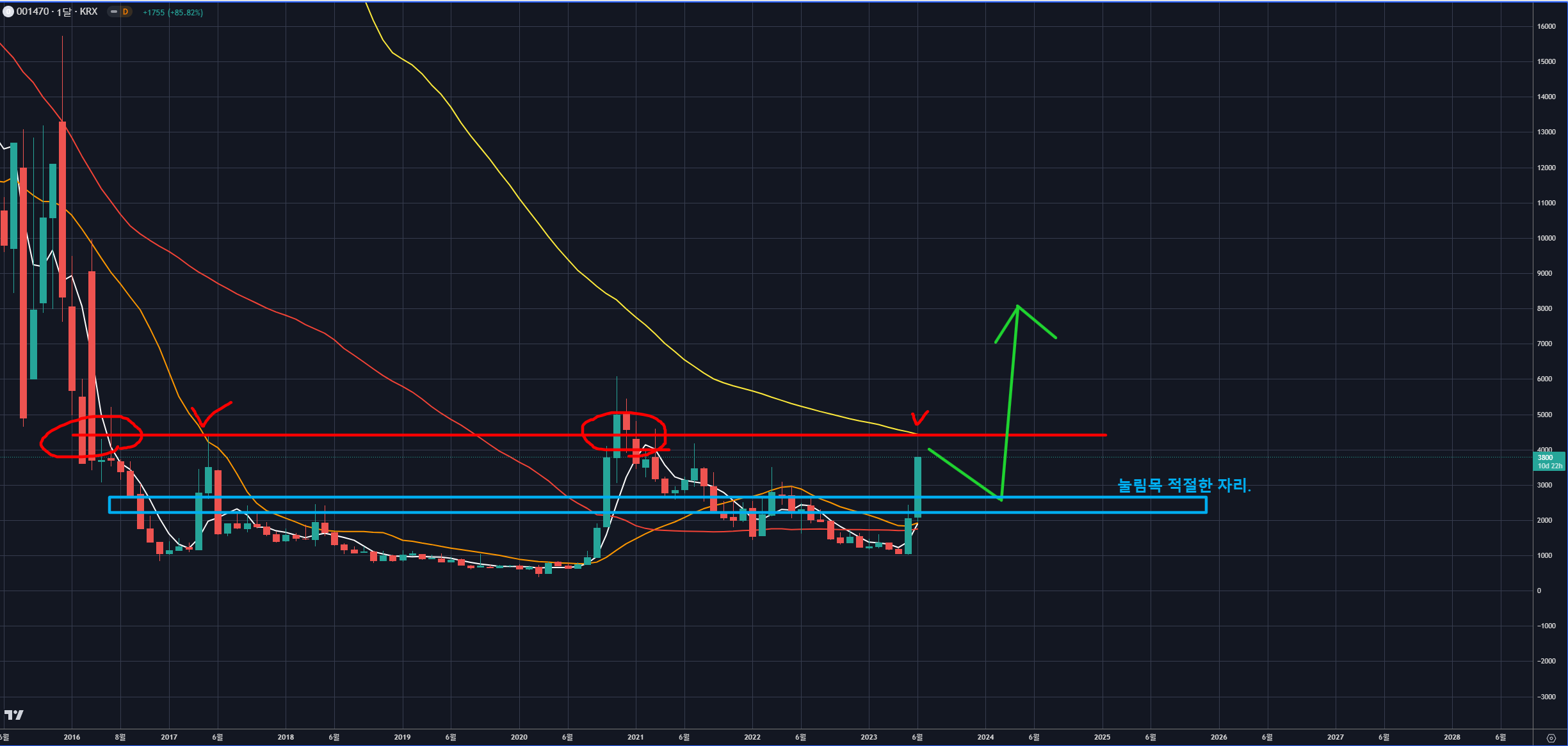그러므로 현재 진입보다는 현 구간부터 하락하거나~월봉 노란색 120이평 부근 저항을 예상하시고, 파란색 수평매물대 자리즈음에서 지지받고 상승으로 전환될 때 진입하면 좋을 것 같네요. 이렇게 된다면 120이평 아래 모든 월봉 이평선이 수렴하면서 상승으로 발산하기 좋게 만들어질 것으로 보입니다.