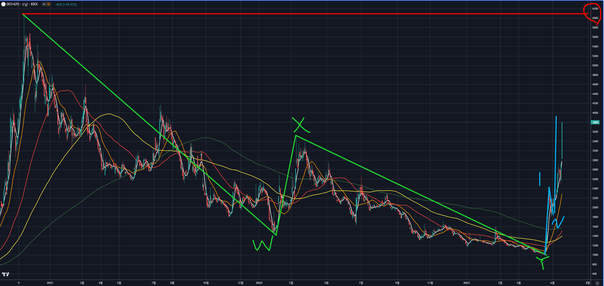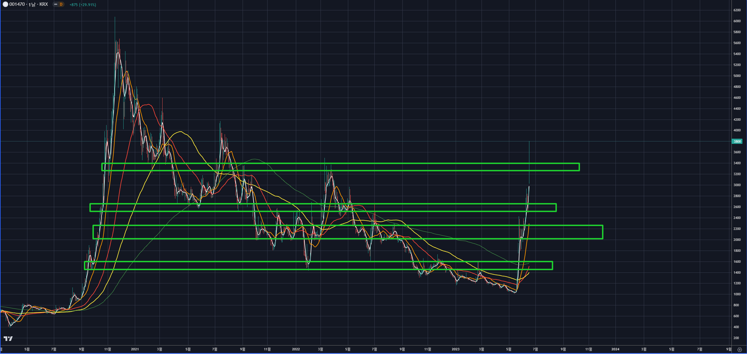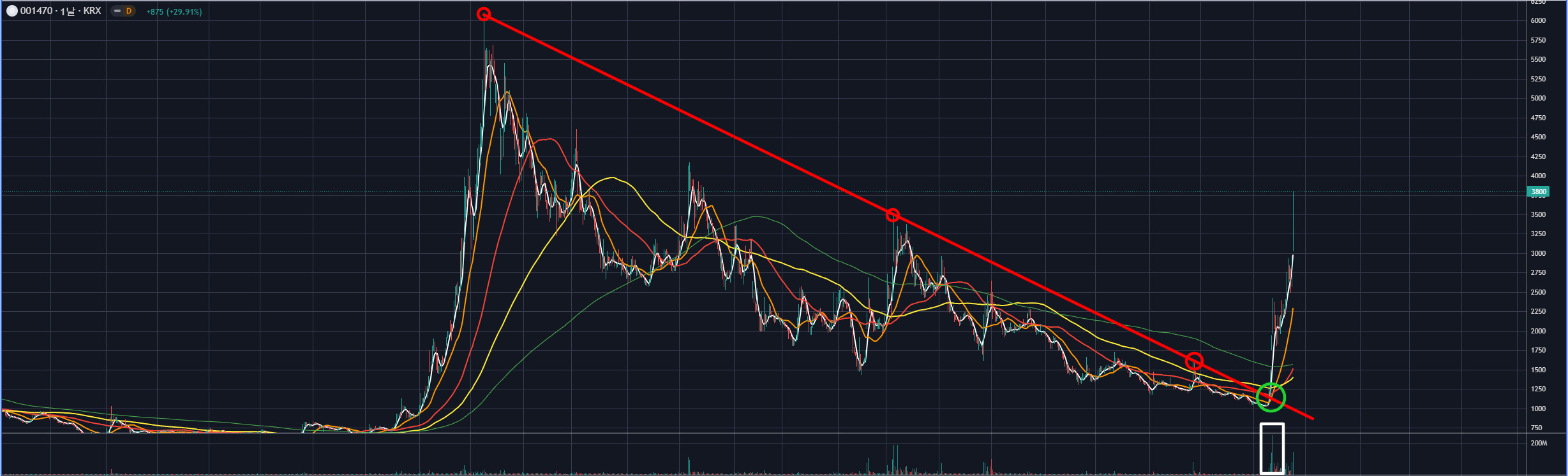 위 삼부토건 4시간 봉 차트를 보면, 여러개의 초록색 하락추세선을 상향돌파했음은 물론, 빨간색의 주요한 하락추세선을 상향돌파한 것이 보입니다. 더 이상 오르지 않을 수 없는 차트였어요.