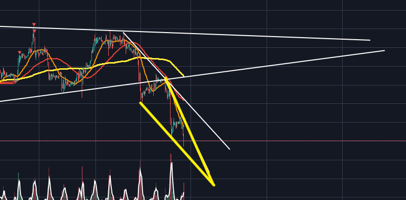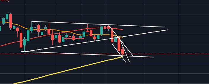 위의 차트를 보시면 삼각수렴이 하방이탈하여, 다시 하락 평행채널을 이루었습니다.