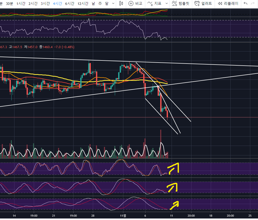 아래로 슈팅한다해도 저 노란색 120이평을 지지받고 상승할 것으로 보여집니다.