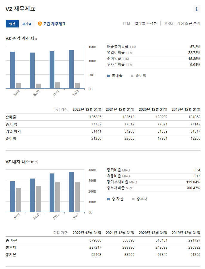 위와 같이 버라이존의 배당금은 1년에 1주당 2.61$인 7.02%를 받을 수 있습니다. 10% 이상 배당주도 있다고 하지만, 7%도 낮은 건 아니라고 생각되네요. 코로나 시국부터 현재까지 매출과 영업이익이 줄어든 일반적인 기업들과 다르게, 버라이존은 꾸준히 성과를 내고 있는 기업으로 보입니다. 배당률도 7%니 주주들 생각은 해주는 기업으로도 보이고요. 앞으로 통신분야는 AI, 메타버스, 5G 등의 주류 테마와 연관되어 있기에 지속 가능한 실적을 낼 것이라 생각됩니다.
