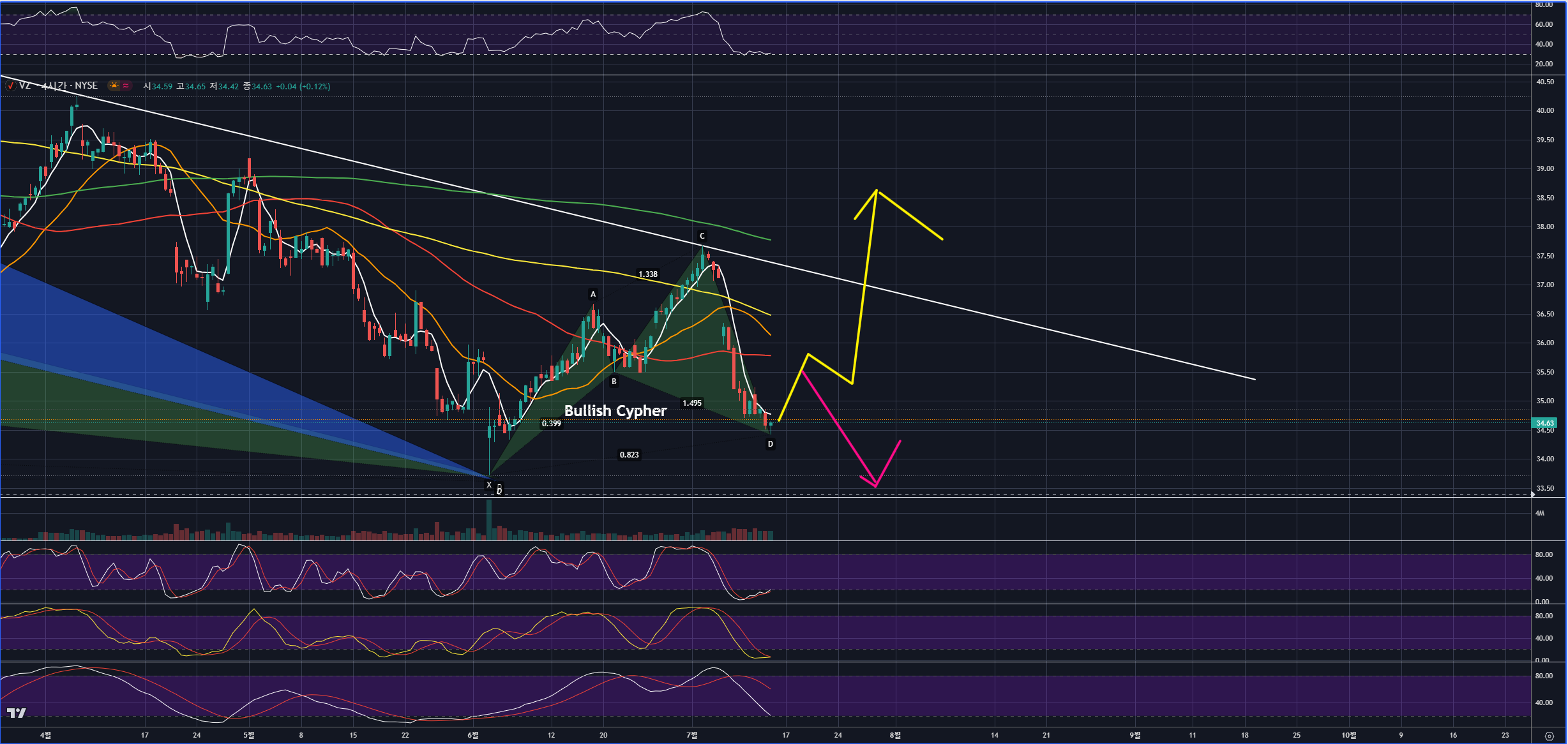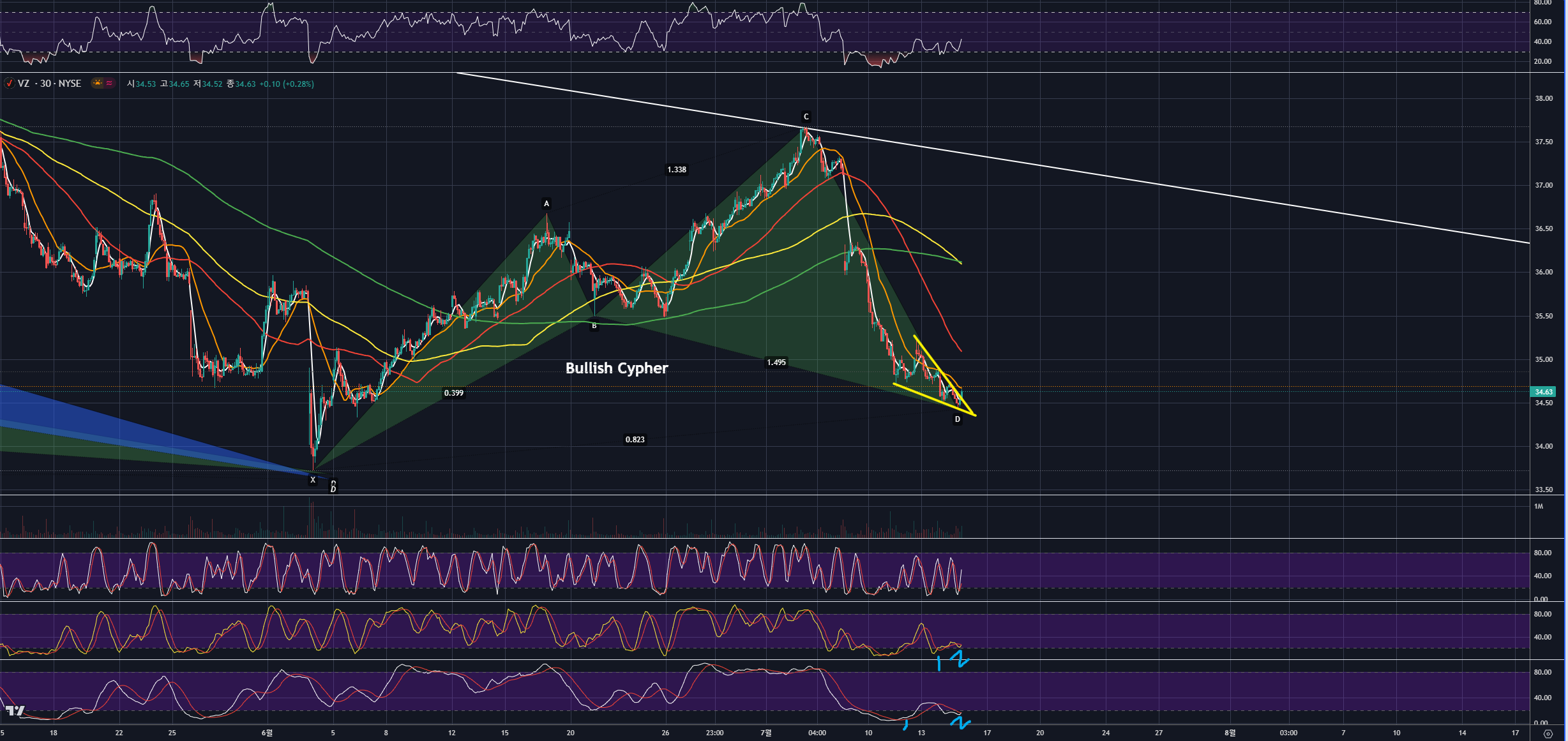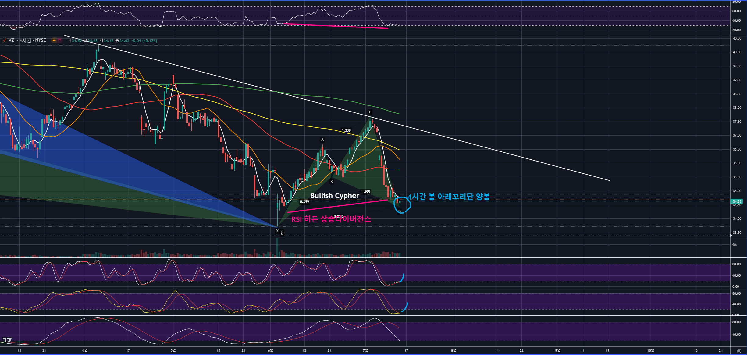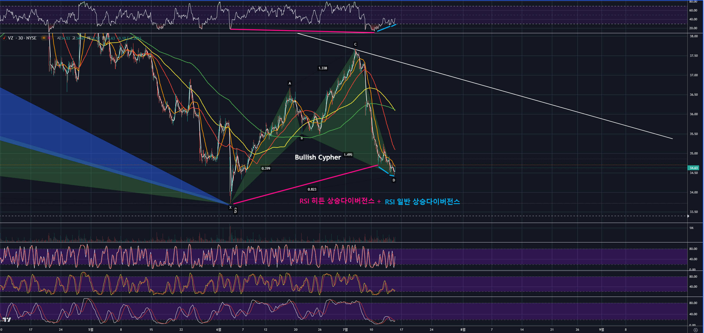 버라이존 30분 봉은 조정을 한 후 현재 Bullisy Cypher Pattern PRZ에서 RSI 히든+일반 상승다이버전스가 나온 상태입니다.