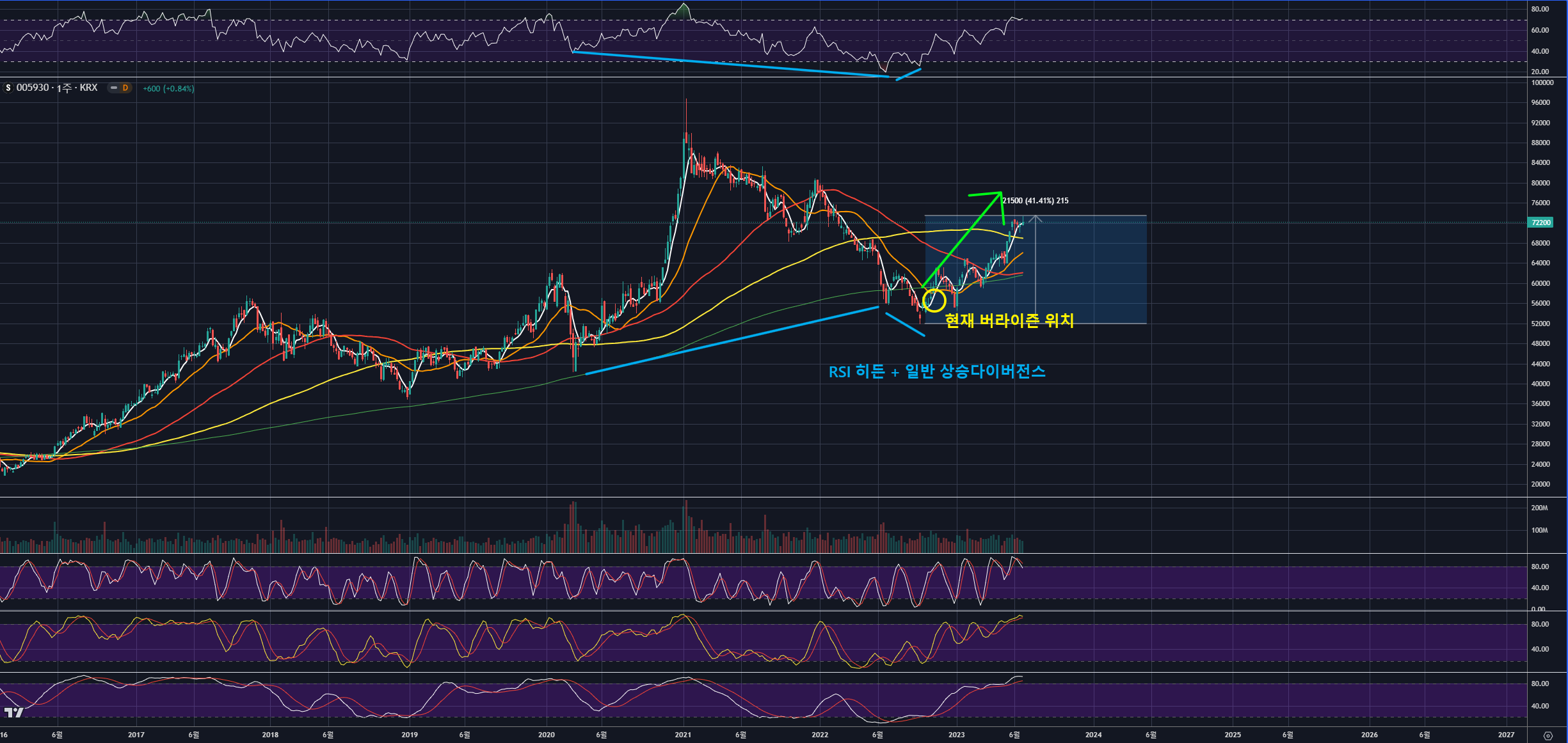 또한 처음 소개한 월봉상 RSI 히든+일반 상승다이버전스가 이 지지받을 구간에서 생성된 것이기에 상승반전 신뢰도가 증가하죠.