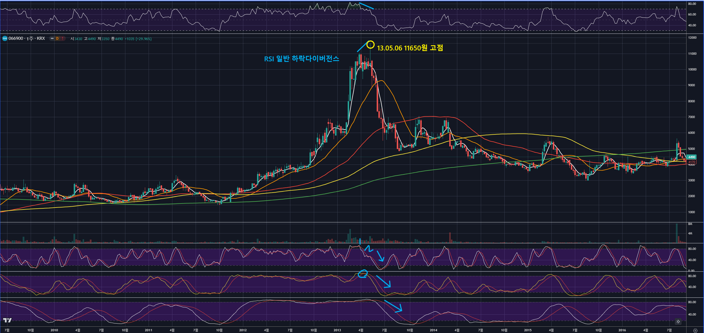 디에이피는 13년 5월 6일 주봉 RSI 일반 하락다이버전스, 533 고점을 낮추는 쌍봉과 1066/201212 데드크로스 우하향하면서 하락추세로 전환되었습니다.