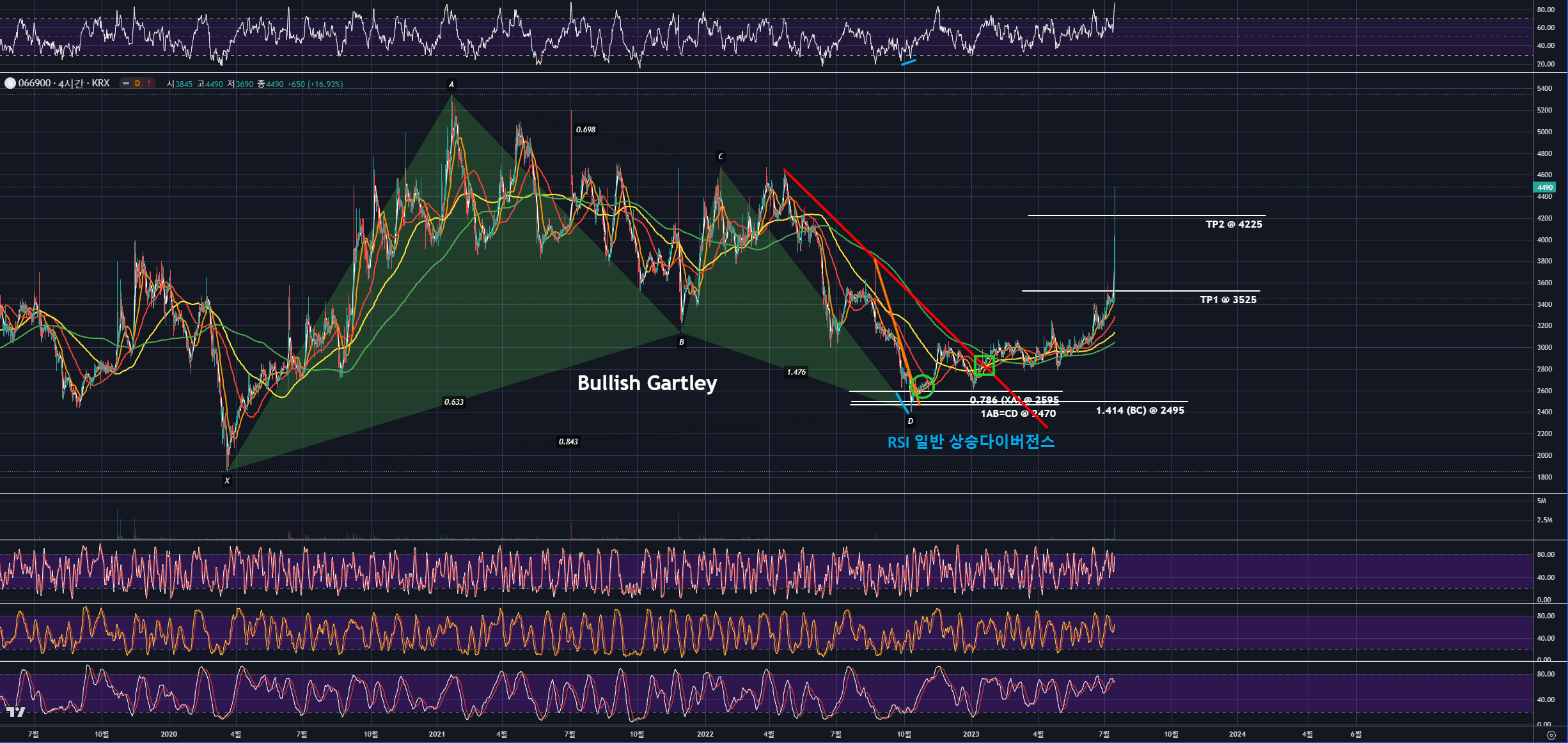상승반전 전 PRZ에서 작게 RSI 일반 상승다이버전스가 나왔고,