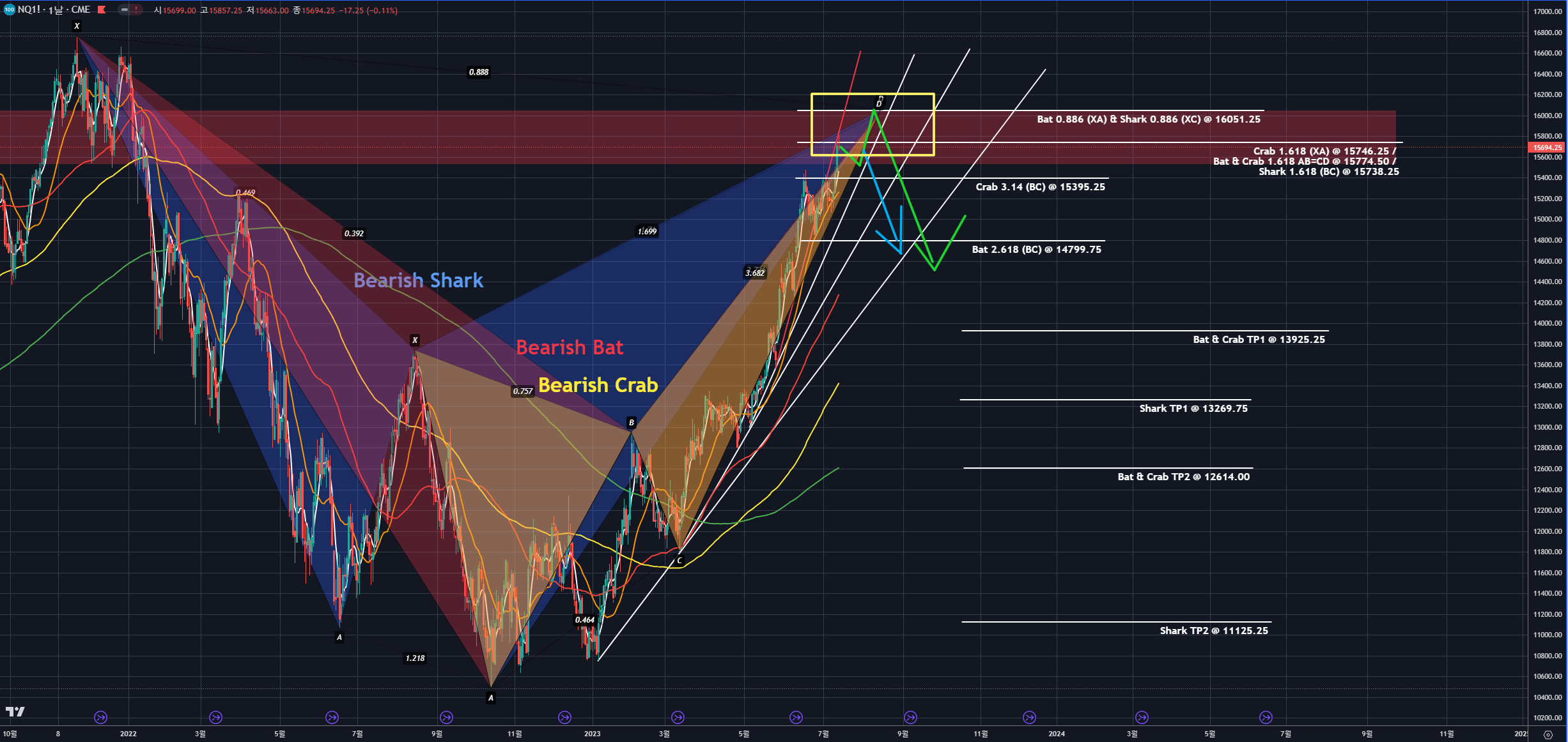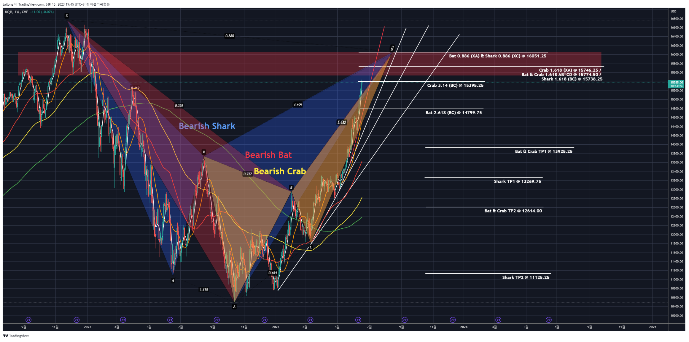 23.06.16 나스닥(NQ1!) 시세 전망 차트분석 (Bearish Shark, Bearish Bat, Bearish Crab Pattern)