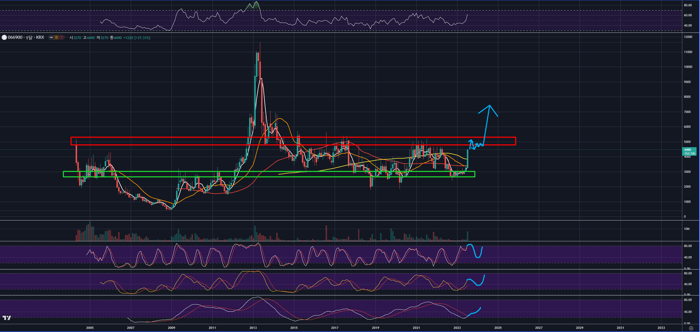 아래에서 설명하겠지만, 곧 강한 수평매물대(월봉에 표시한 빨간색 수평매물대) 저항이 임박했으므로 해당 저항을 확인 후 정리하는 것도 좋아보입니다.