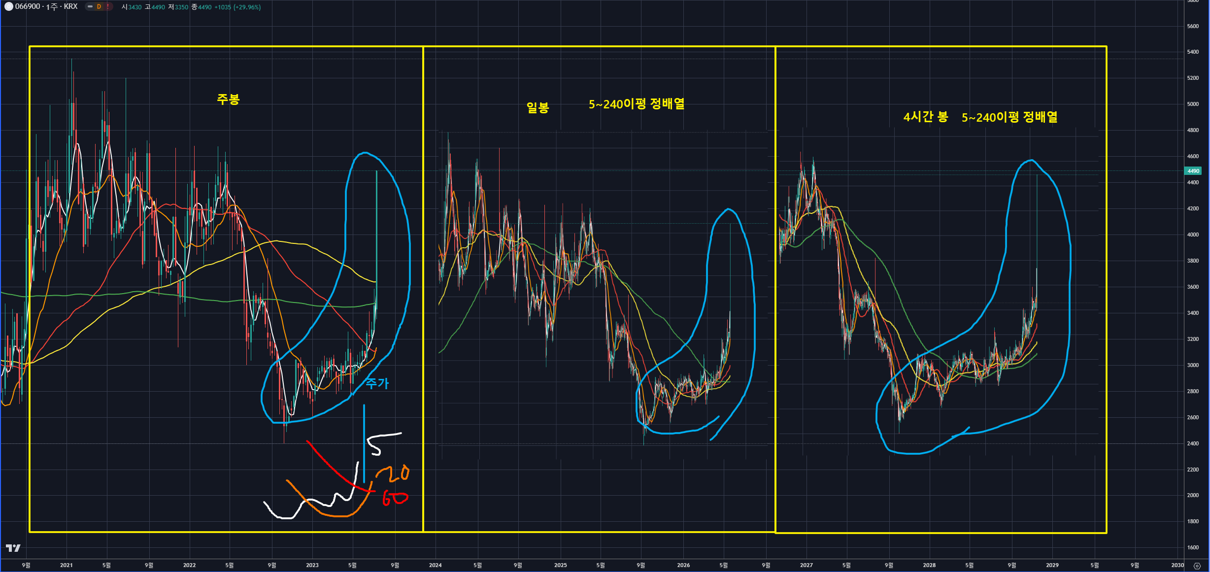 위와 같이 일봉과 4시간 봉의 이동평균선은 5~240이평까지 모두 정배열된 상태이며, 주봉 또한 5이평~60이평까지 정배열이 되어습니다.