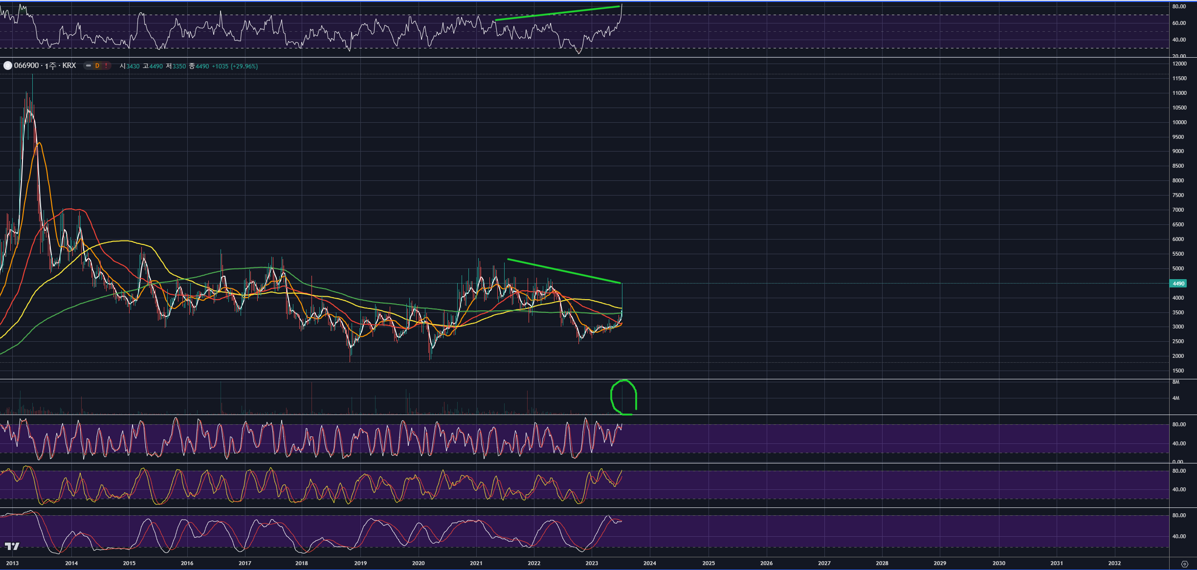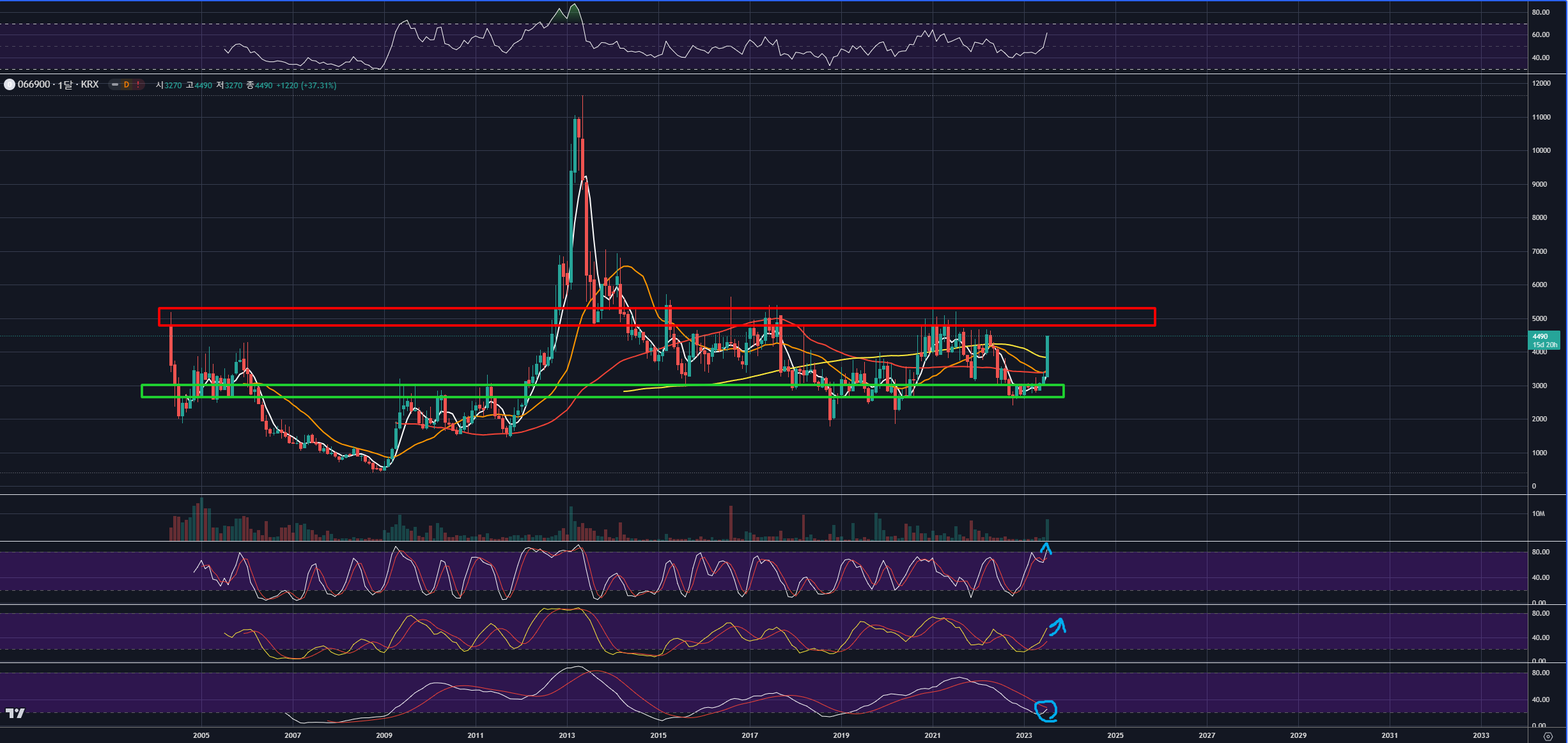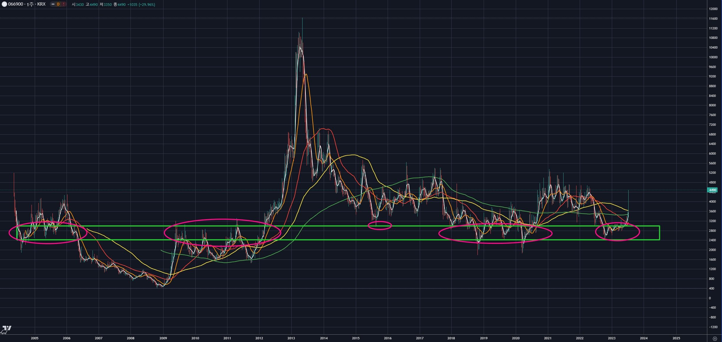 주봉을 보면, 과거 2004년부터 생성된 강력한 수평매물대에서 지지받은 것이 확인됩니다.