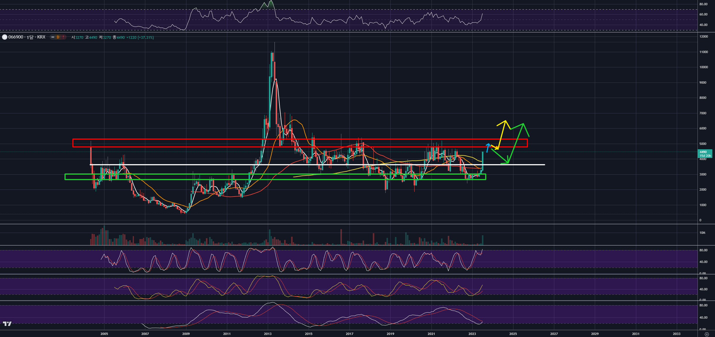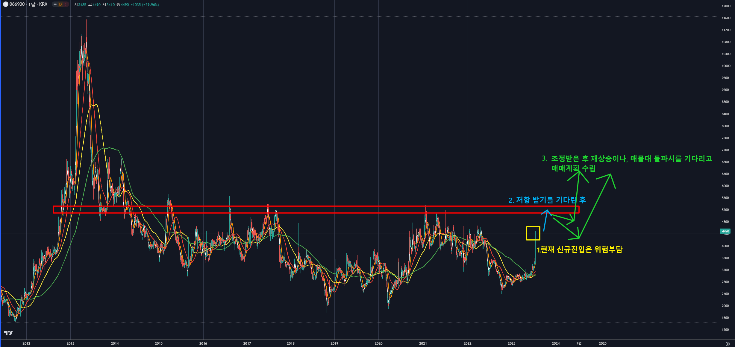 향후 노란색처럼 기간조정 후 바로 상승이나 초록색처럼 중간 매물대에 지지받고 상승돌파를 할 수 있는 두 가지 경우의 수가 있다는 것이죠.