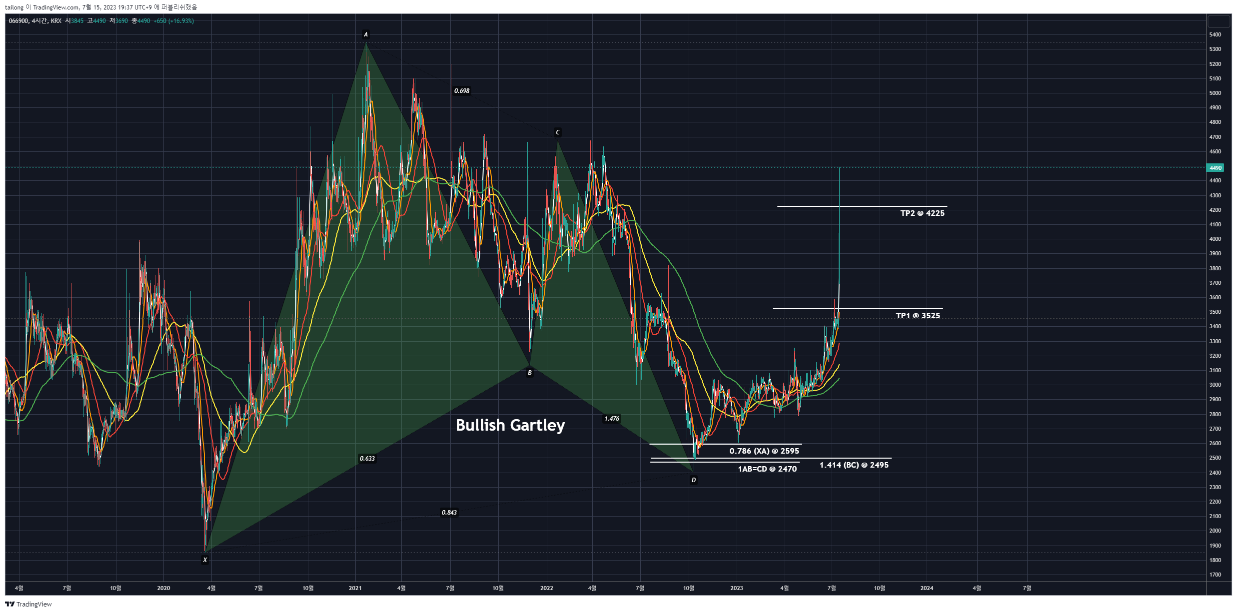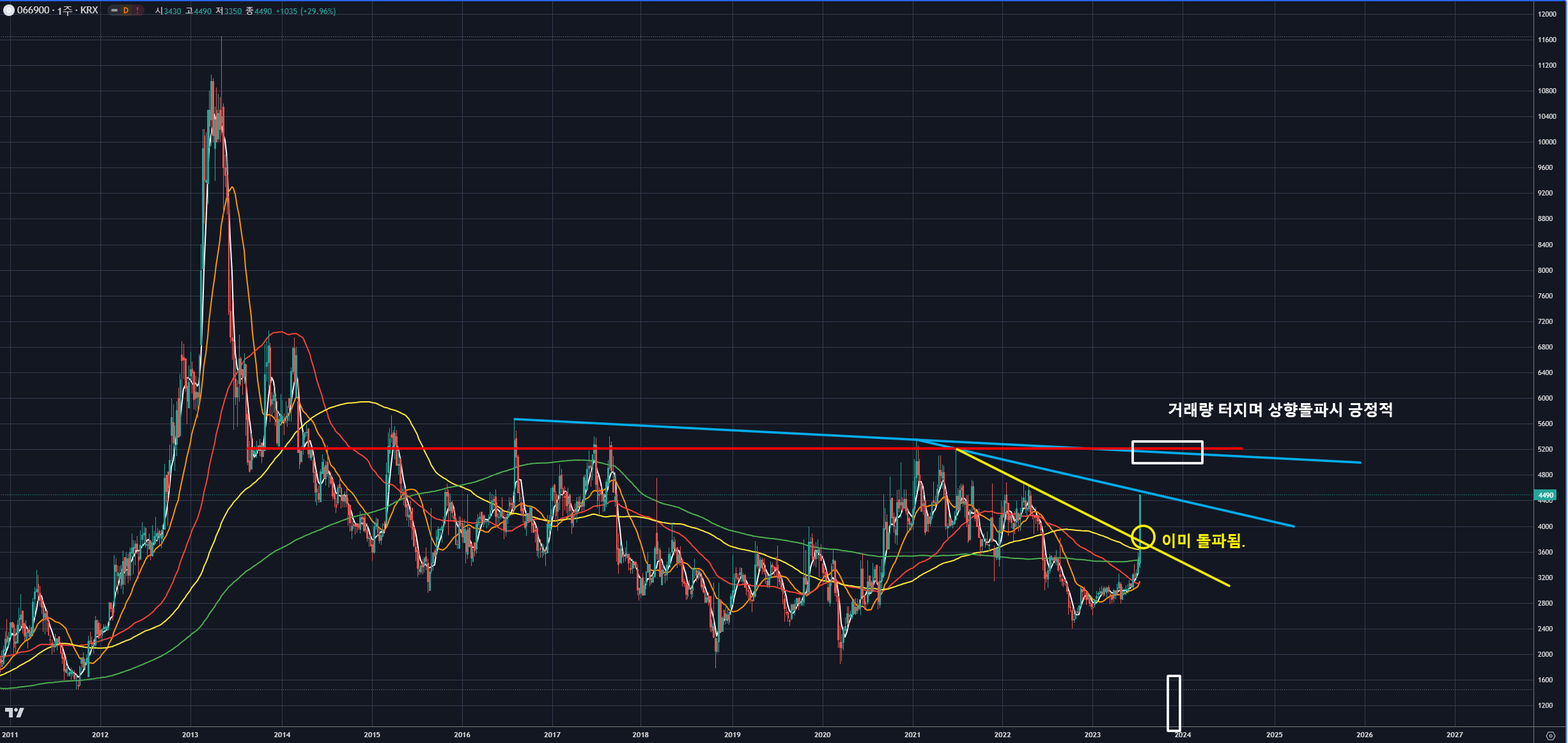 주봉으로 보면, 최근의 노란색 하락추세선을 장대양봉으로 상향돌파한 상태이며,