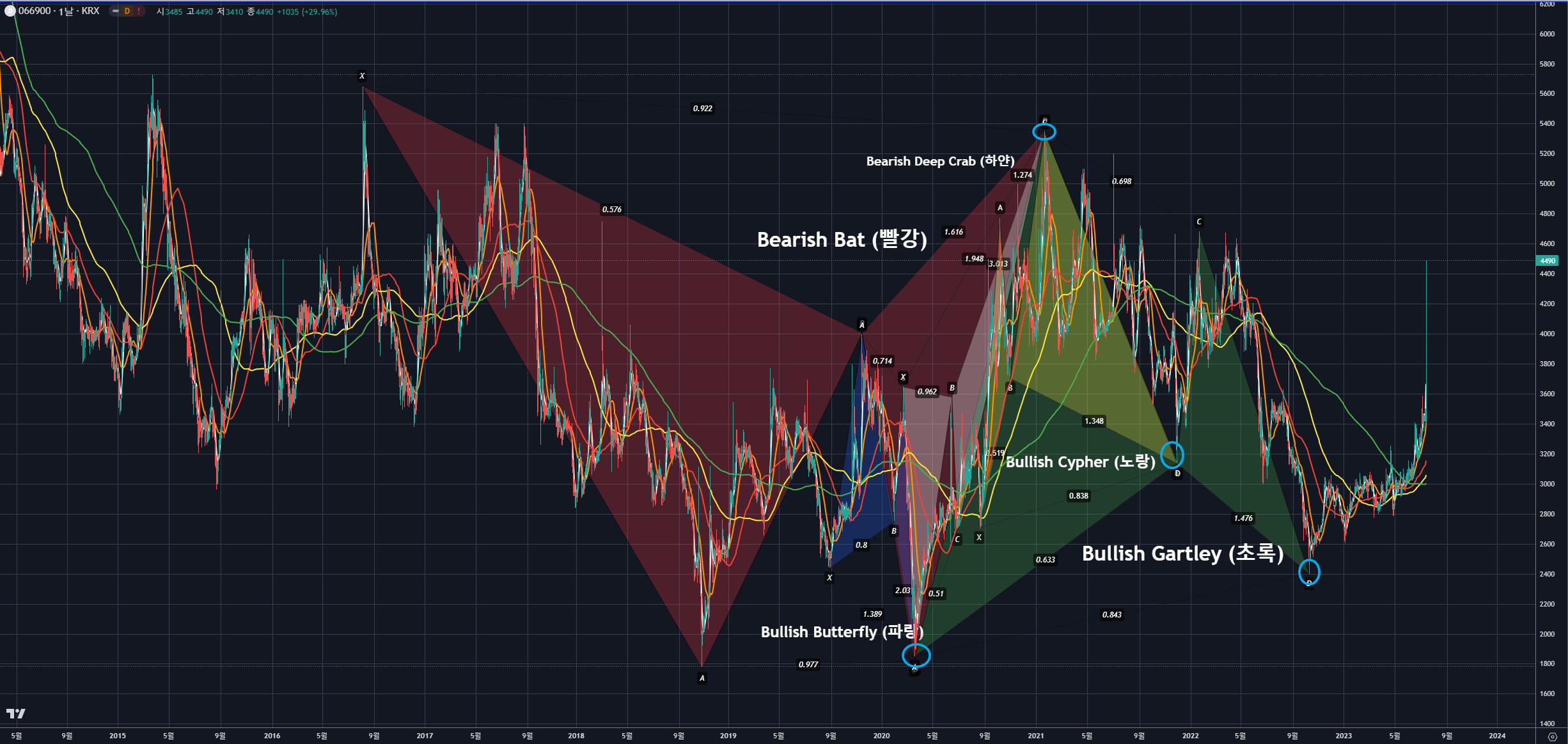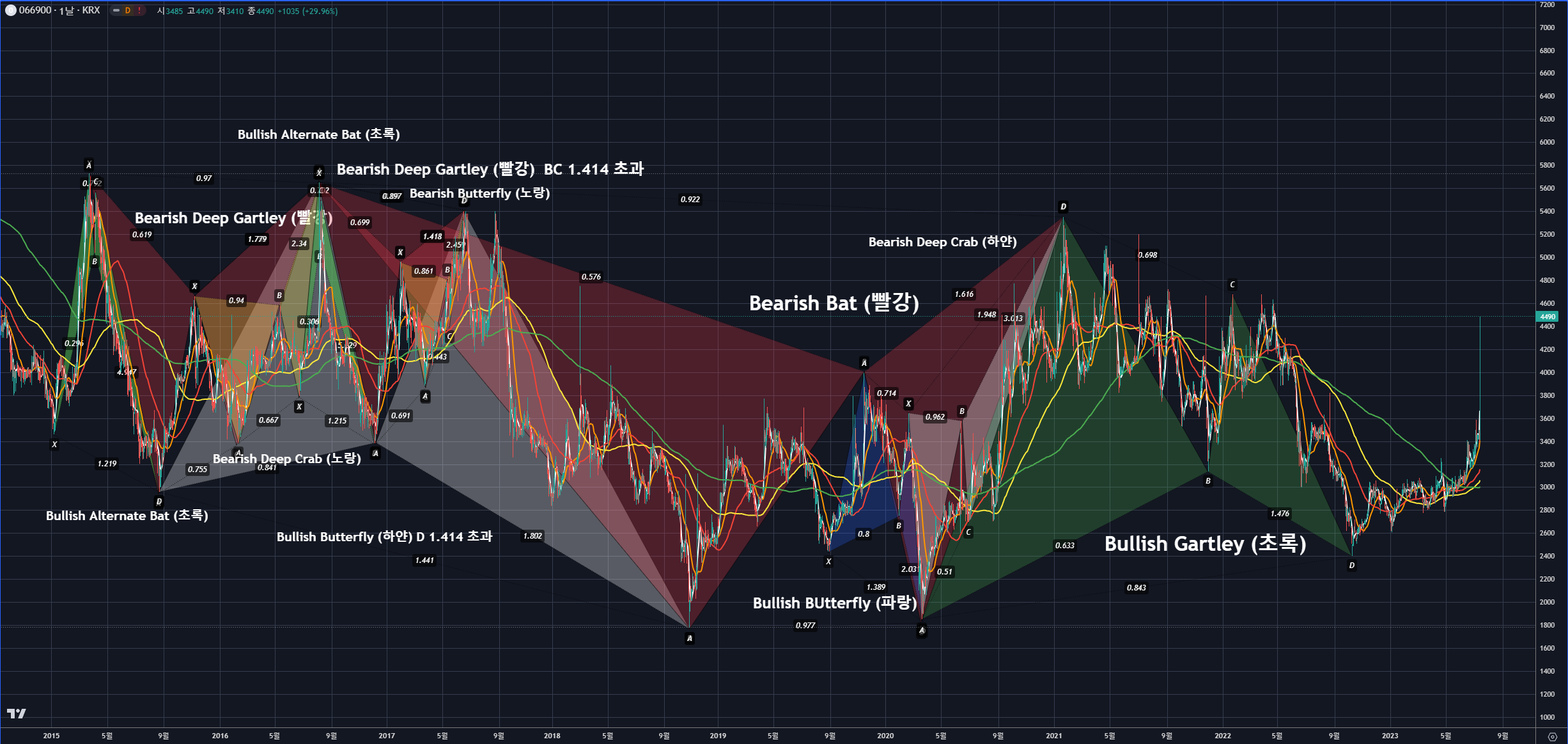 디에이피 차트를 보니 최근에도 하모닉 패턴이 무수히 나온 것이 확인됩니다.