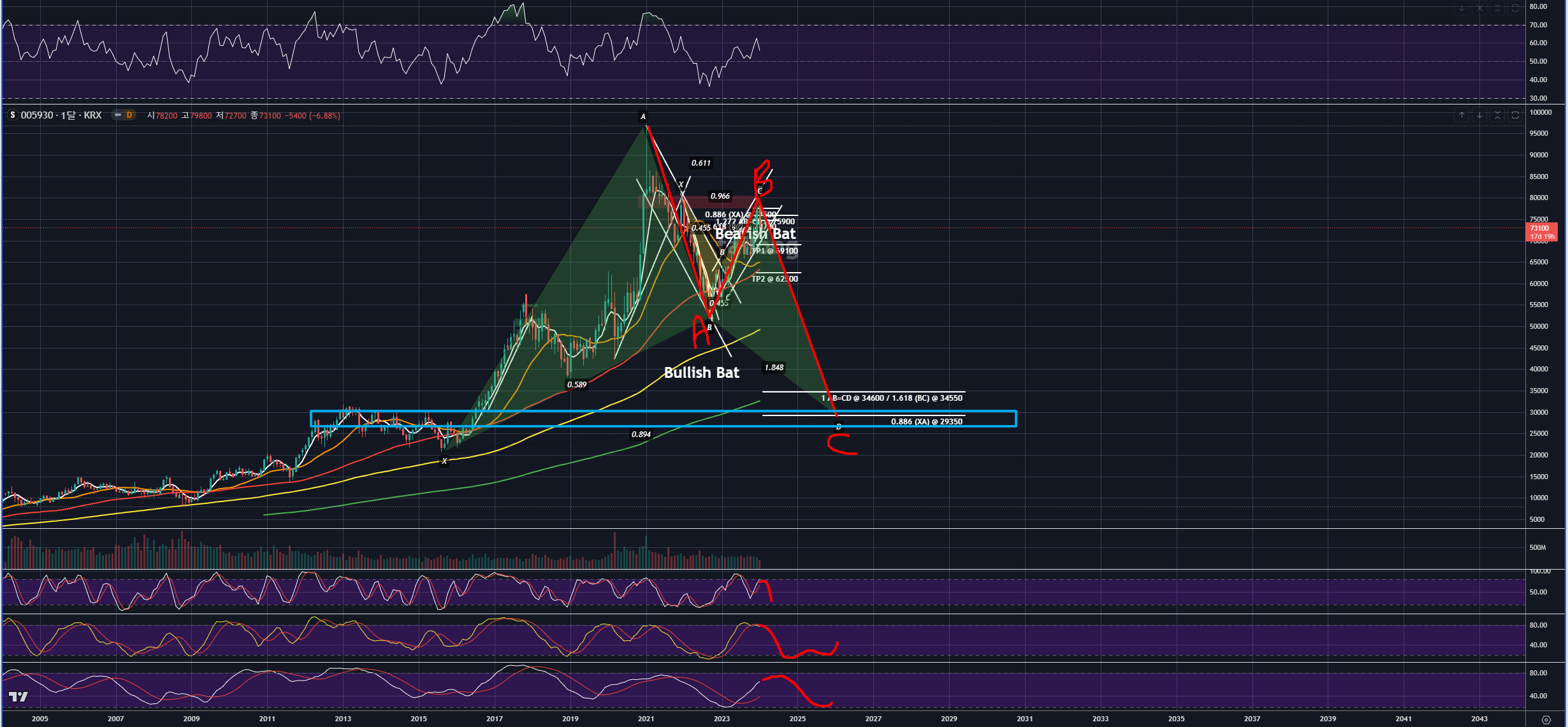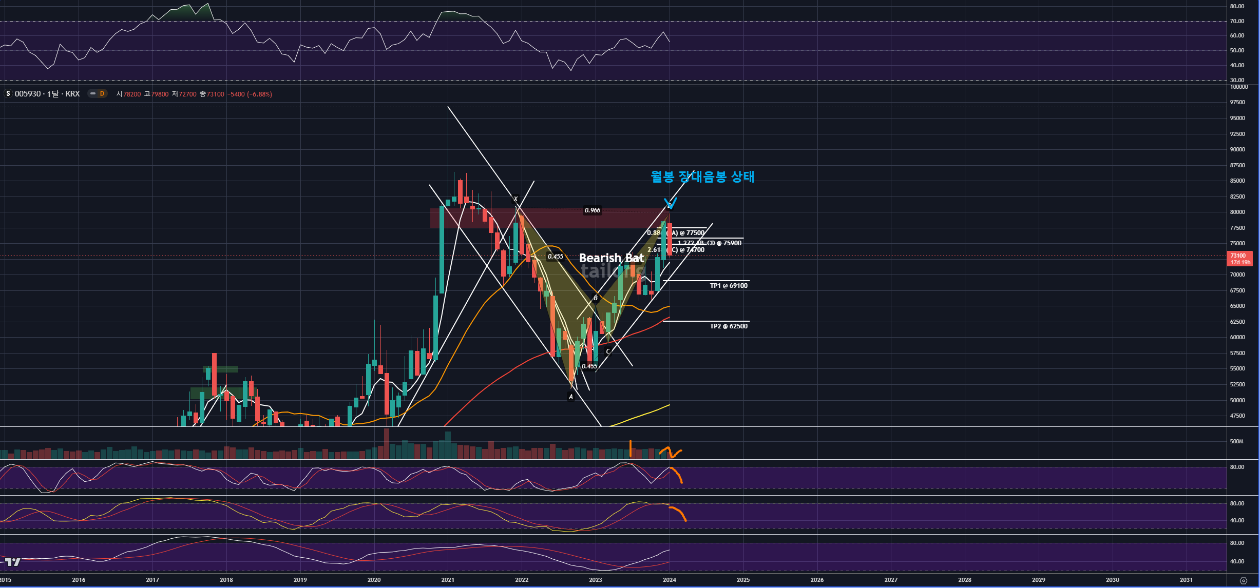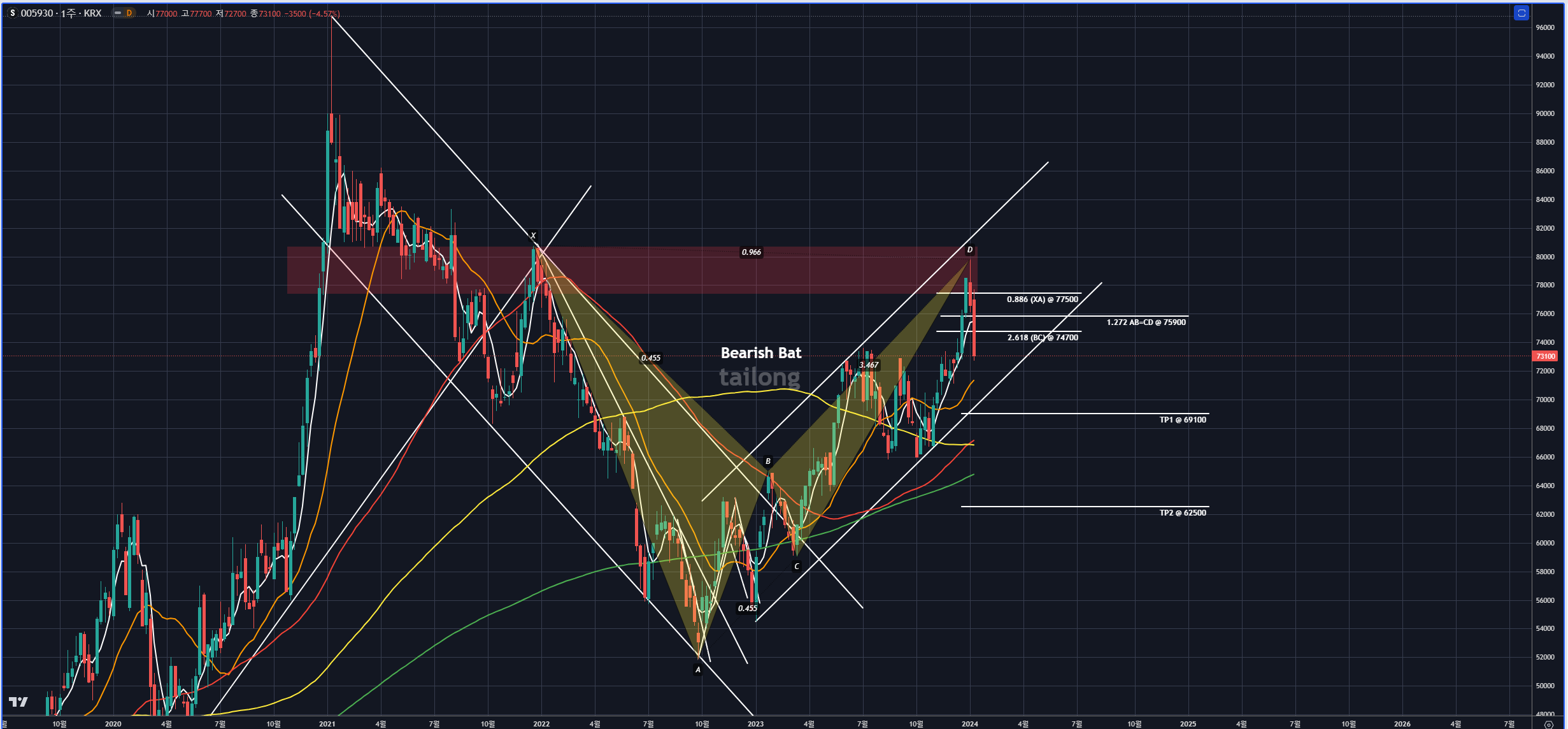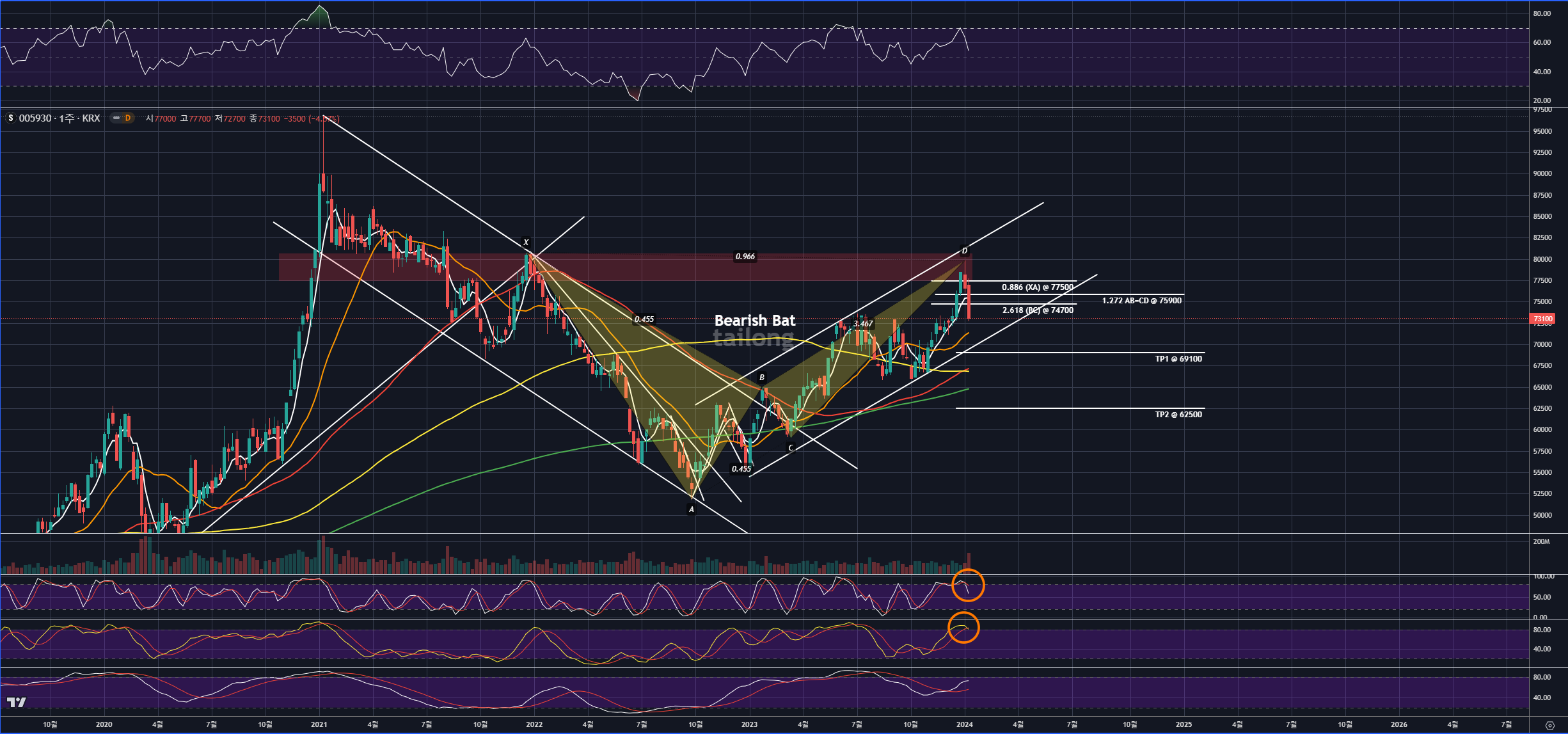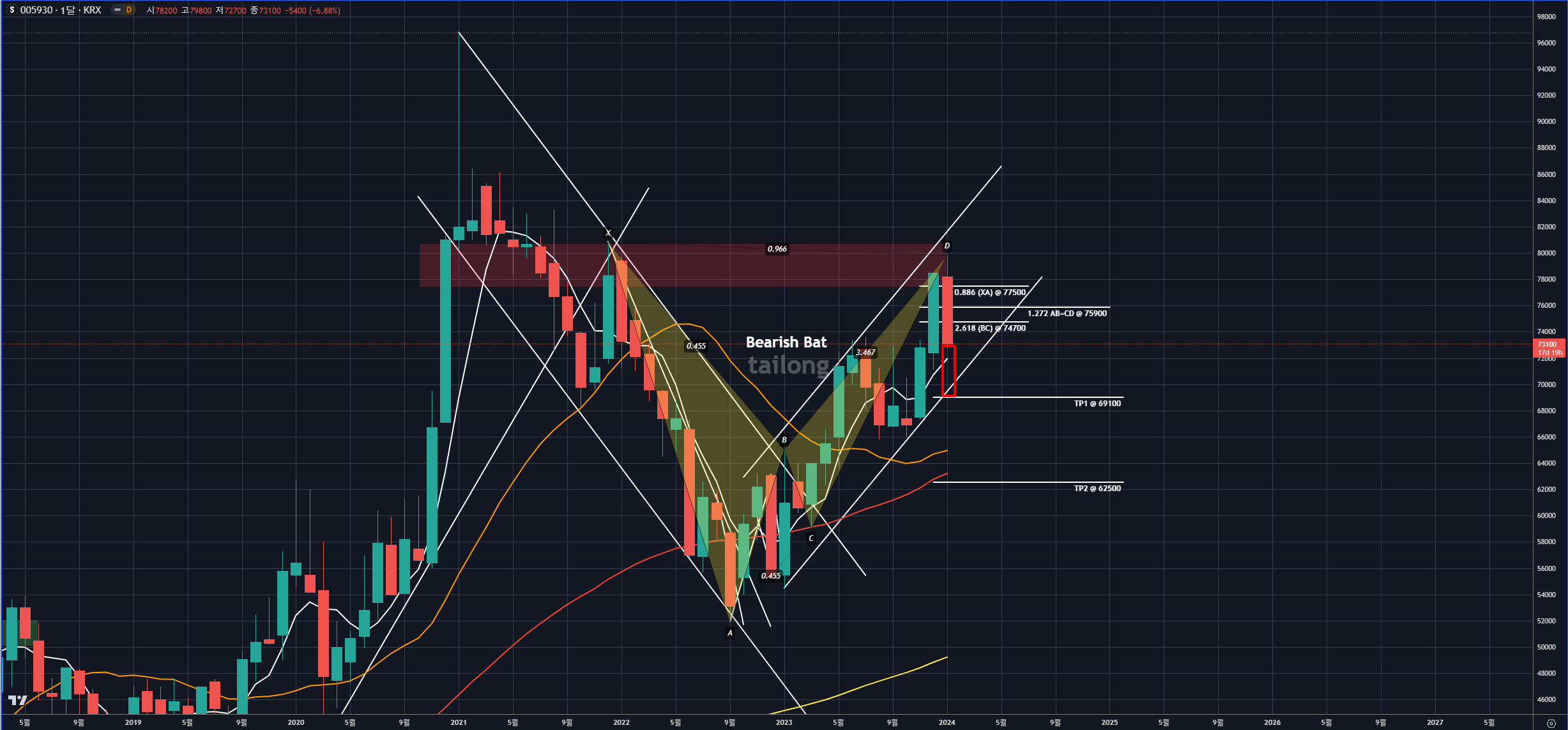 지금과 같은 하락추세가 지속될 경우, Bearish Bat의 TP1까지 1월달의 캔들이 장대음봉으로 형될 여지가 있어요. 아직 13거래일이나 남아있기 때문입니다. 그렇기 때문에, 삼성전자를 보유하고 계신 분들은 포지션을 줄여나가야 하지 않을까싶네요.