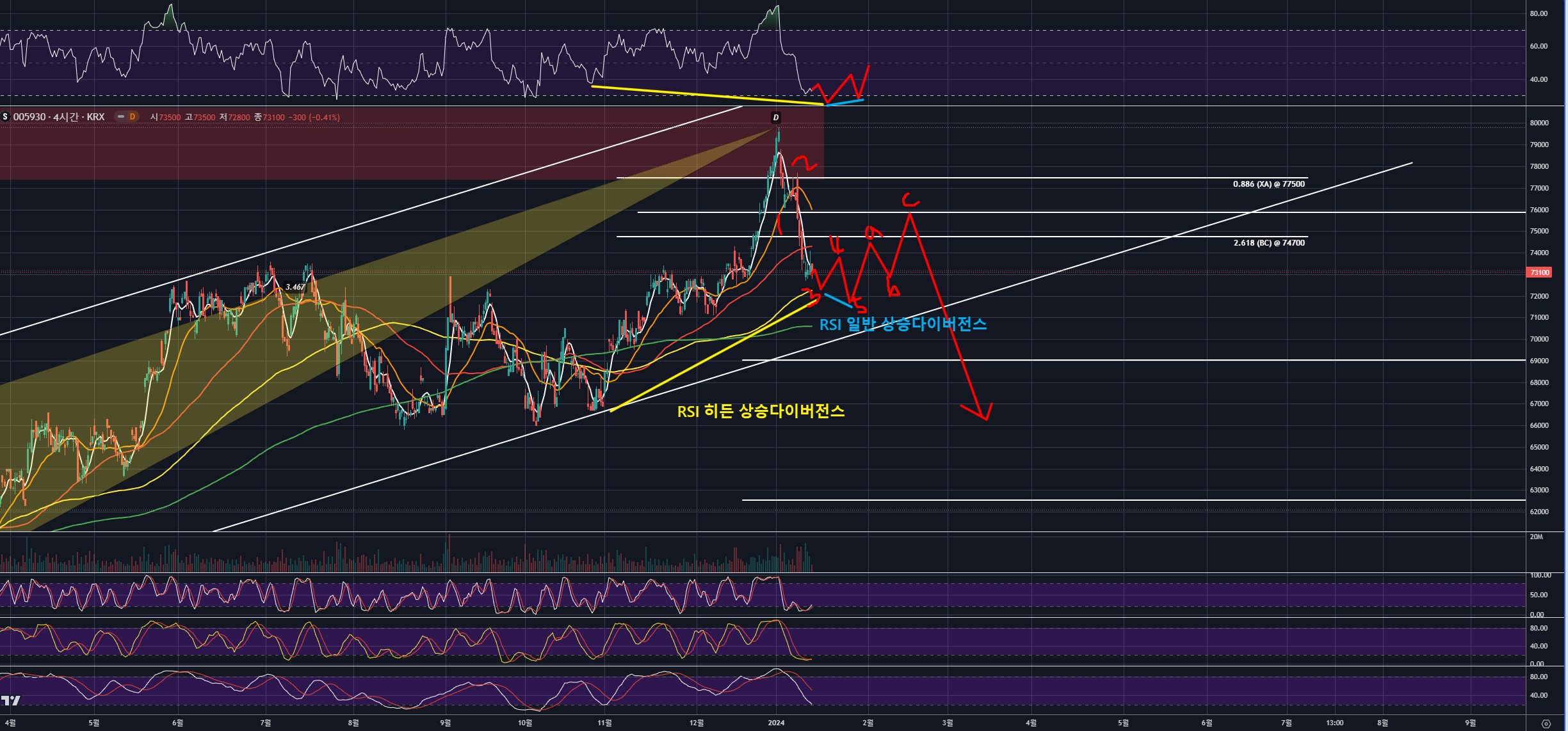 그대로 쭉 하락하기 보다는, 4시간 봉 상 저점이 조금 더 낮아지며 4시간 봉 RSI 히든 상승다이버전스와 RSI 일반 상승다이버전스가 나오며 하락 5파가 마무리된 후 abc 반등이 일어날 때 정리하면 좋을 것 같네요.