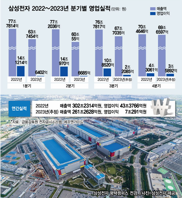 위 그림과 같이 삼성전자의 영업이익은 22년 대비 23년이 매우 많이 떨어졌습니다.