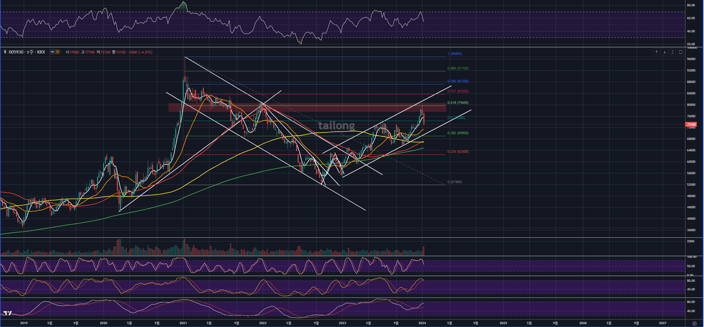 22년말~ 23년 한 해 동안 상승한 삼성전자는 21년 1월 고점과 22년 9월 저점의 피보나치 0.618자리에 있는 수평매물대에서 저항을 받고 있습니다.