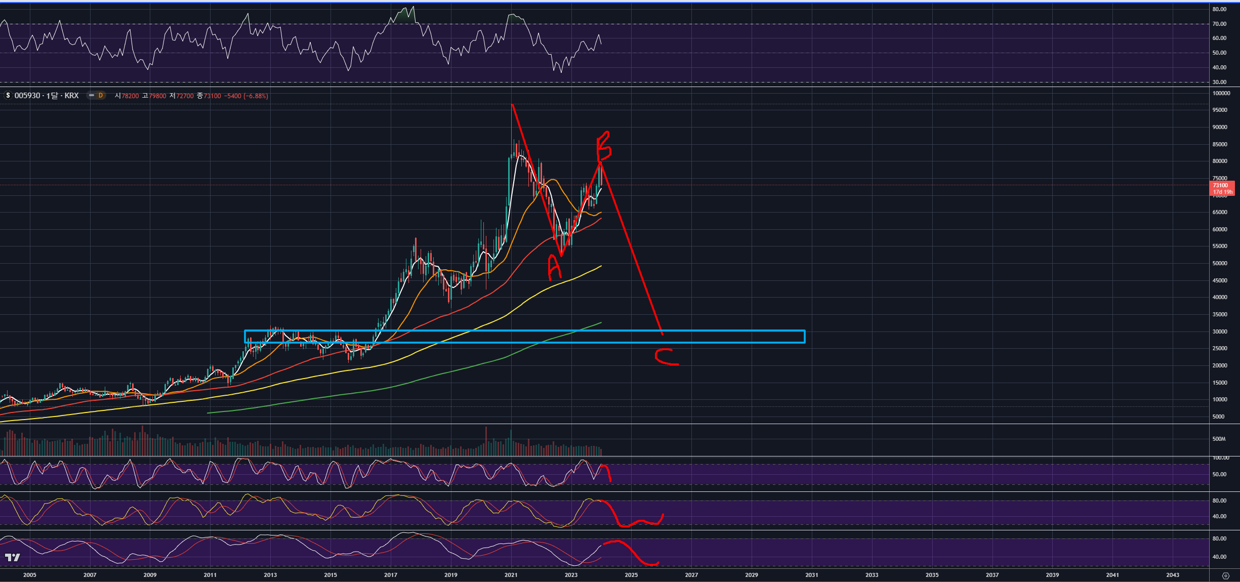삼성전자의 영업이익이 최근 꾸준히 줄어든 것은 찾아보면 알 것입니다. 최근 약간 반등했다곤 하나 역시나 예년이나 최근 5개년 보다 매우 줄어든 상태에요. 반도체분야에서 TSMC에게 밀리는 상황이 계속 온다면, 향후 전망 또한 좋지 않다고 생각됩니다. 이것이 차트의 흐름으로도 반영되어 하락 C파가 강력하게 나올 것이라 생각하는 것이고요.