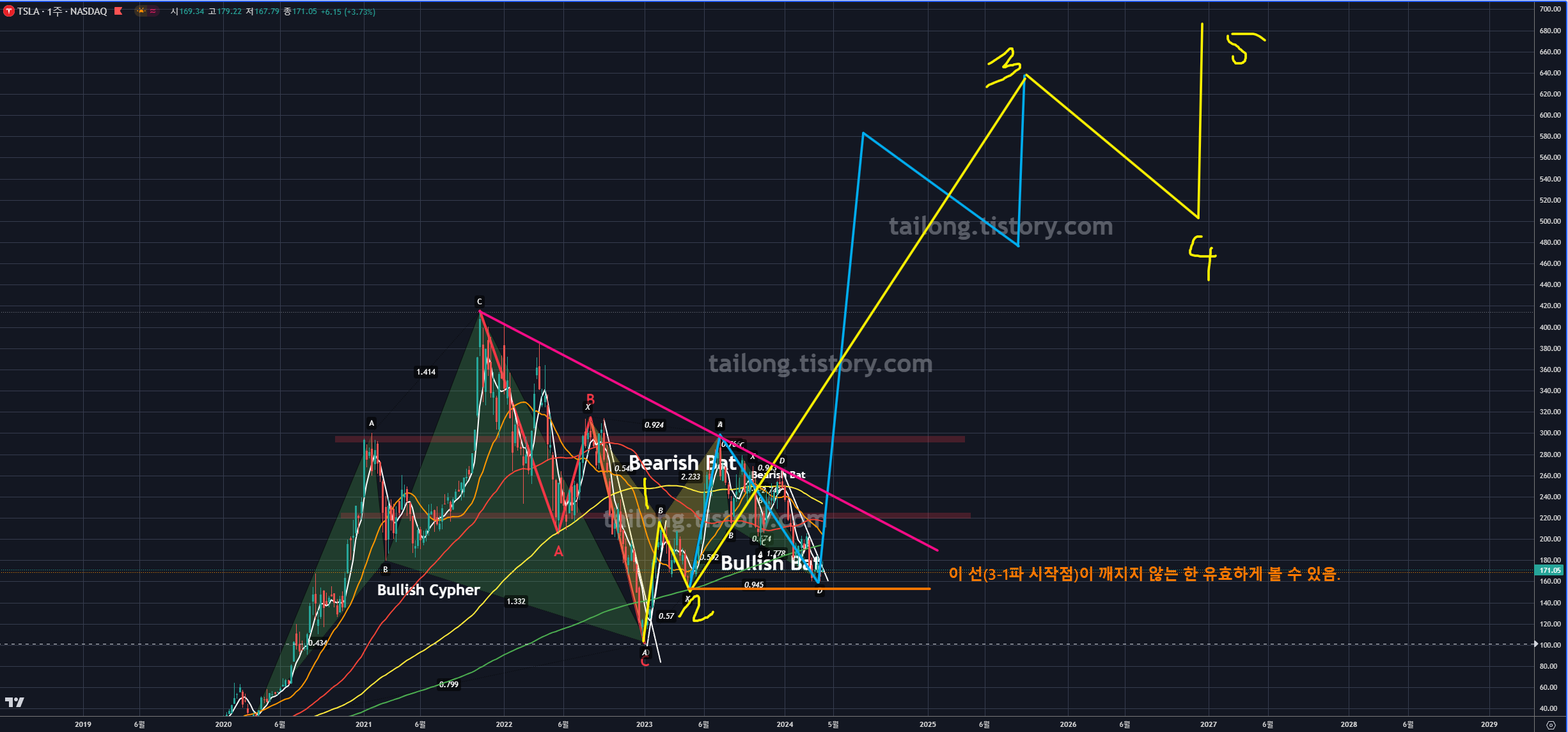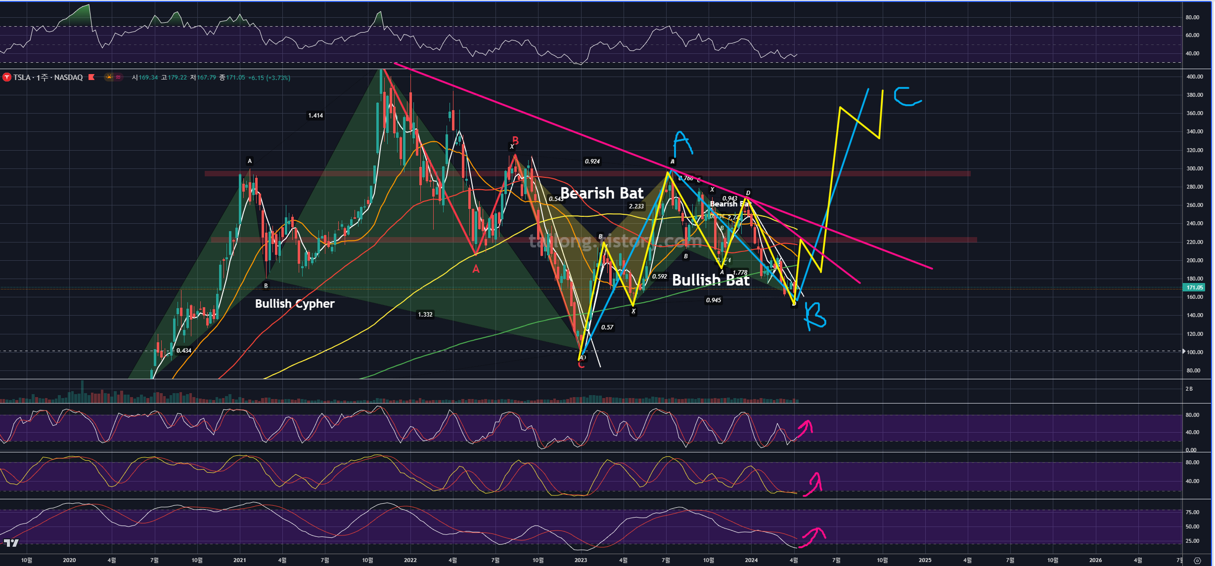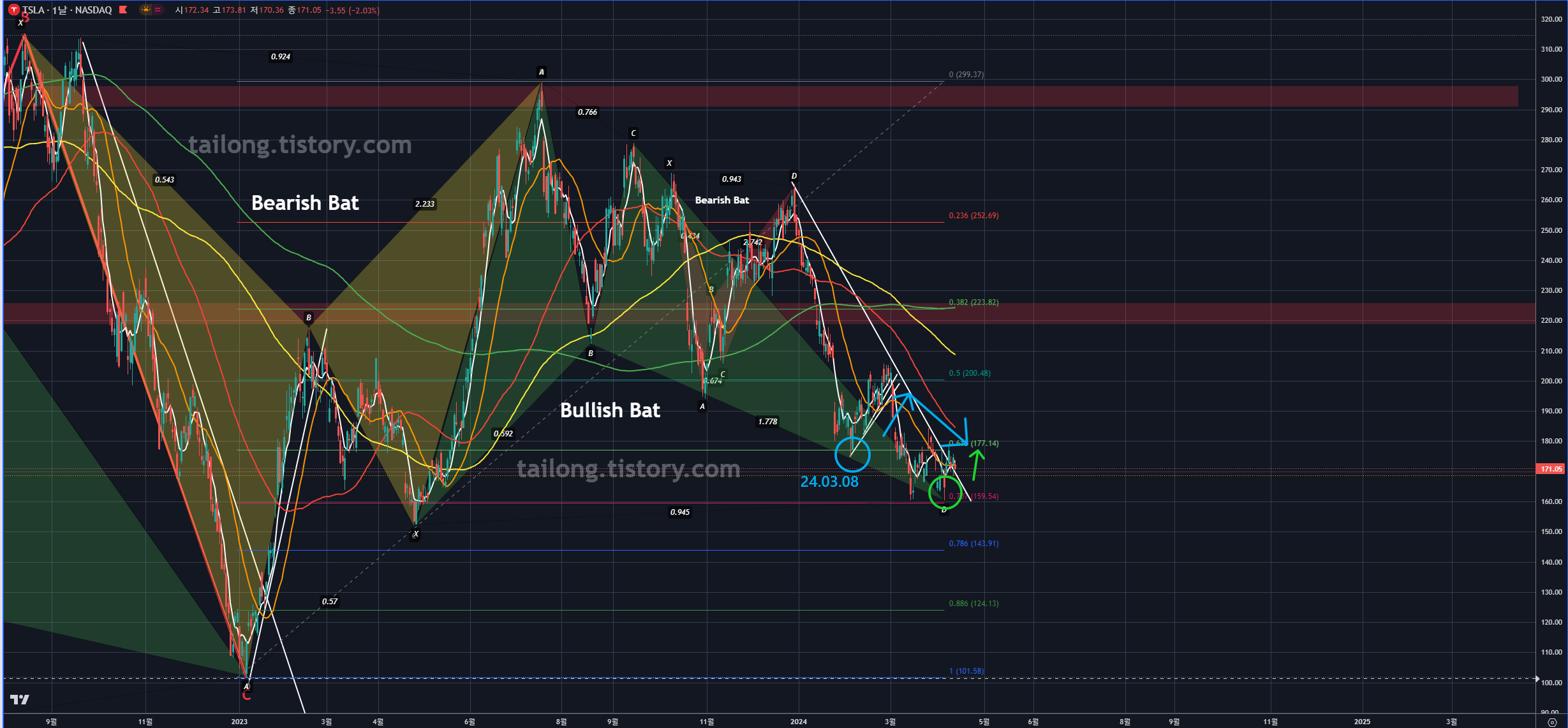 24년 4월 15일 현재 시점으로, 테슬라는 초록색 Bullish Bat의 PRZ에 도달 후 상승반전 중입니다.