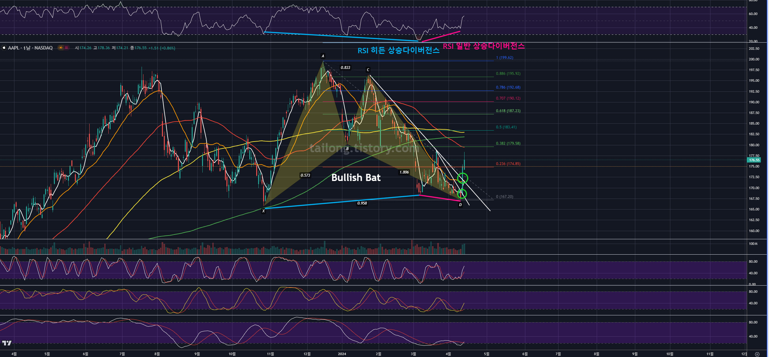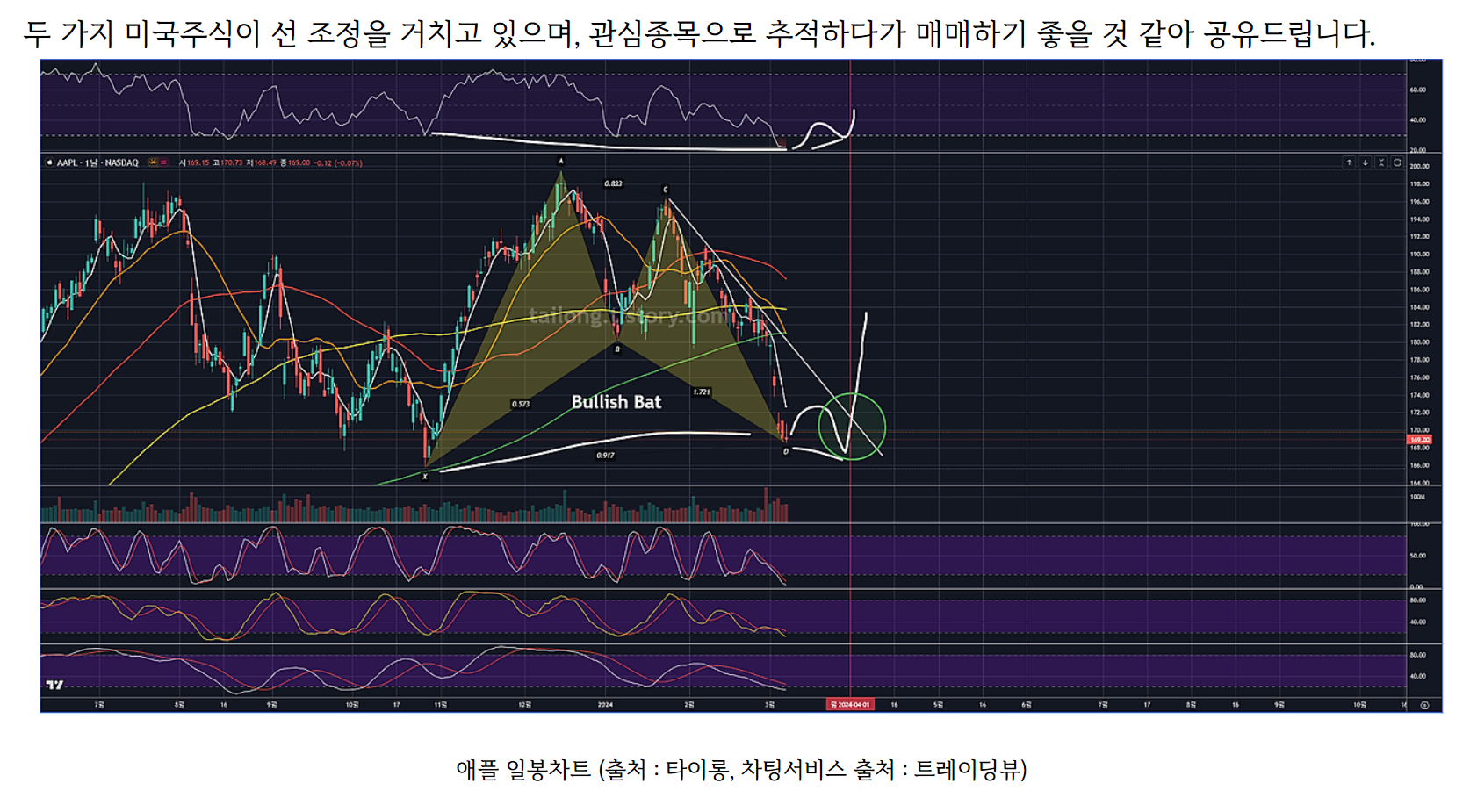 두 가지 미국주식이 선 조정을 거치고 있으며, 관심종목으로 추적하다가 매매하기 좋을 것 같아 공유드립니다. 애플의 경우, 일봉상 Bullish Bat의 PRZ에 도달한 상태이며, 좌익과 우익의 비율이 비