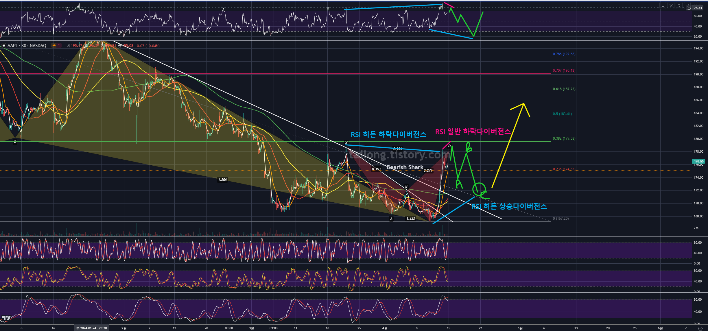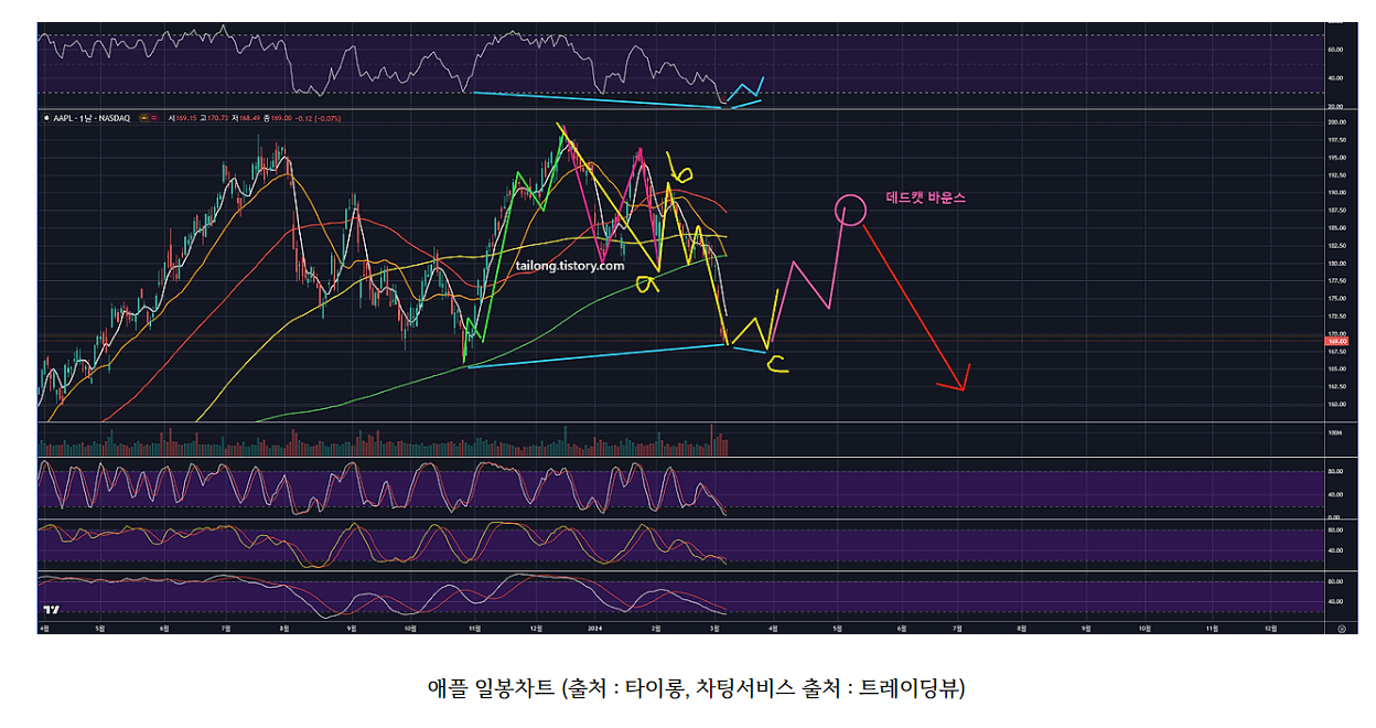 24년 4월 15일 현재, 과거 작도해둔 차트대로 본다면 애플은 반등 후 일봉상 저점을 갱신해서 위와 같이 상승한 모습입니다.