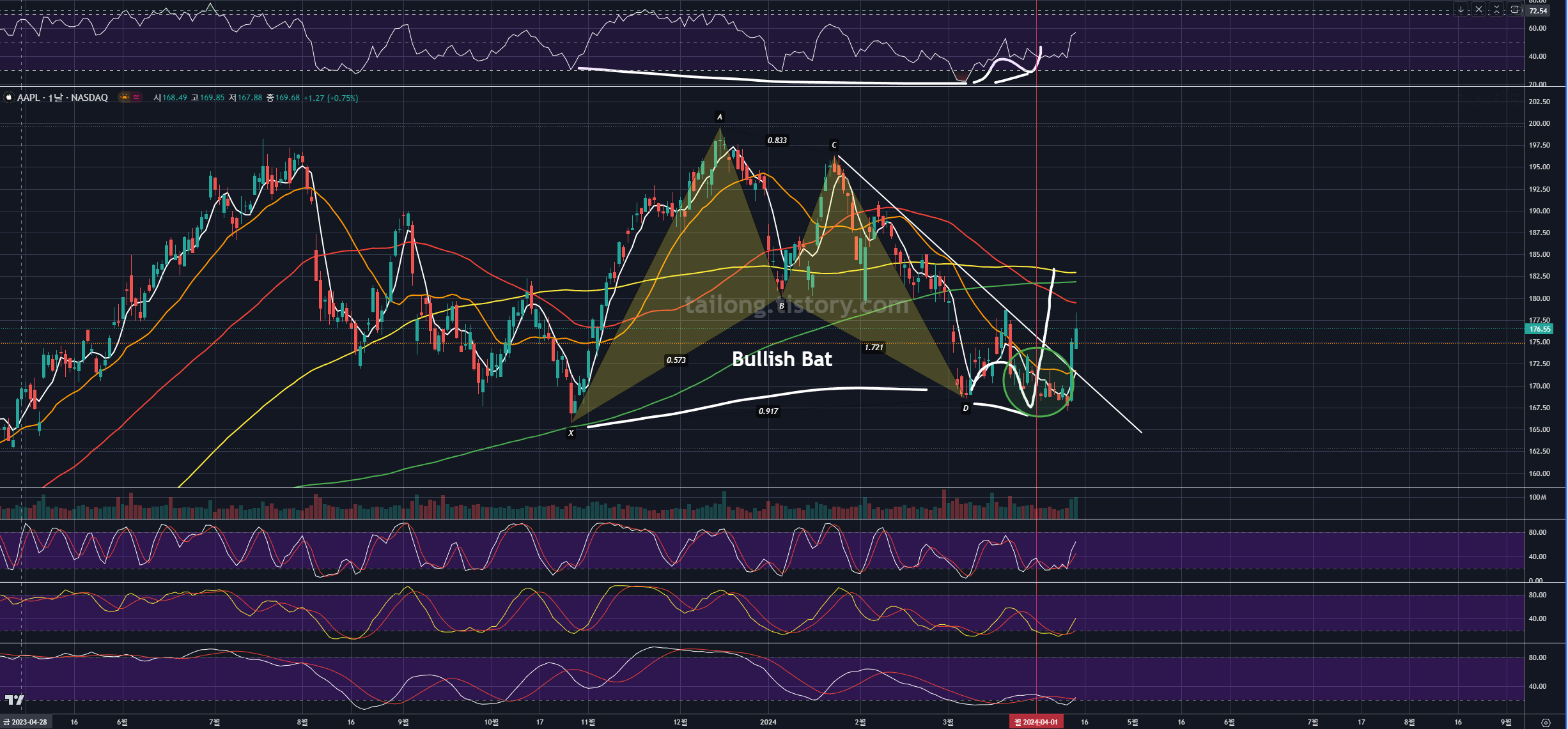 24년 4월 15일 현재, 과거 작도해둔 차트대로 본다면 애플은 반등 후 일봉상 저점을 갱신해서 위와 같이 상승한 모습입니다.