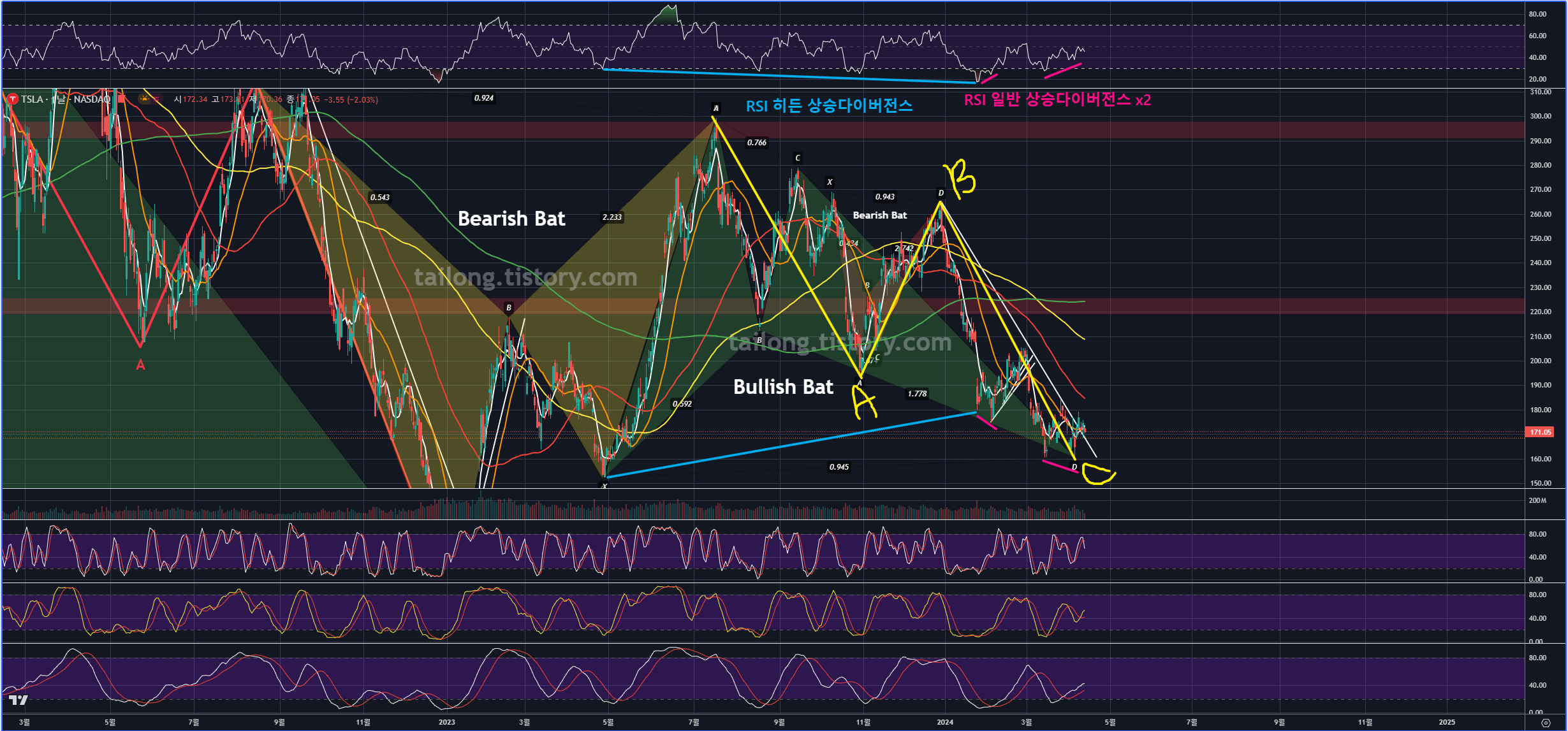 24년 4월 15일 현재 시점으로, 테슬라는 초록색 Bullish Bat의 PRZ에 도달 후 상승반전 중입니다.