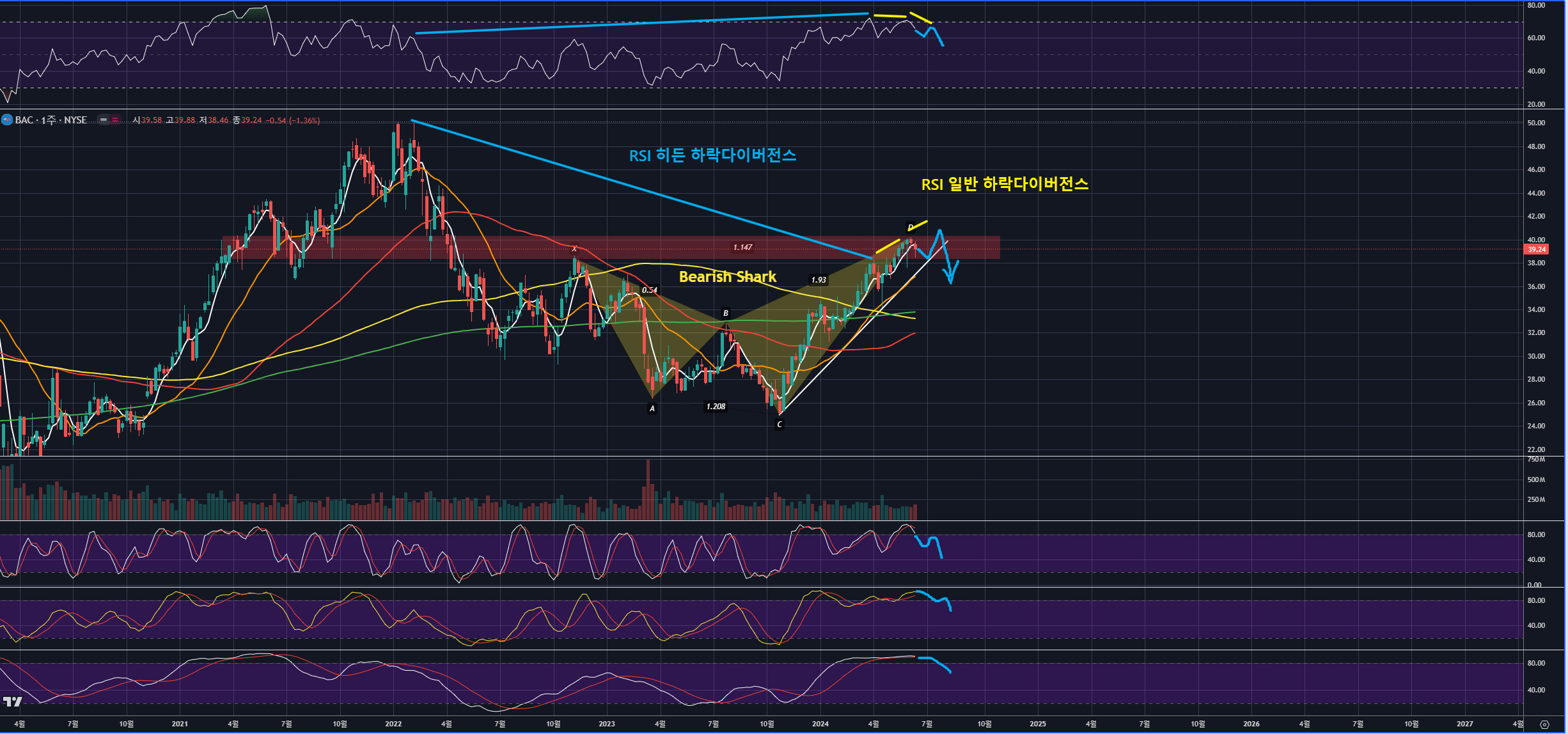 뱅크 오브 아메리카의 경우 주봉상 Bearish Shark의 PRZ에서 반락 중이며, RSI 히든 하락다이버전스와 RSI 일반 하락다이버전스 조합이 적용 중입니다. RSI 일반 하락다이버전스 기준으로 좌측 RSI 과매수는 뾰족하고, 우측 RSI 과매수는 둥근모양으로 완만하므로, 이 자리에서 바로 하락하기보다 파란색대로 고점을 1회 더 높여서 RSI 일반 하락다이버전스를 다시 한 번 주는 경우 더 예쁜 그림의 하락 근거가 갖춰질 것으로 보이네요. 이럴 경우 주봉상 스토캐스틱 533이 고점을 낮추는 쌍봉, 1066이 데드크로스나 고점을 낮추는 쌍봉이 나오며 순차적으로 우하향할 것으로 보입니다.