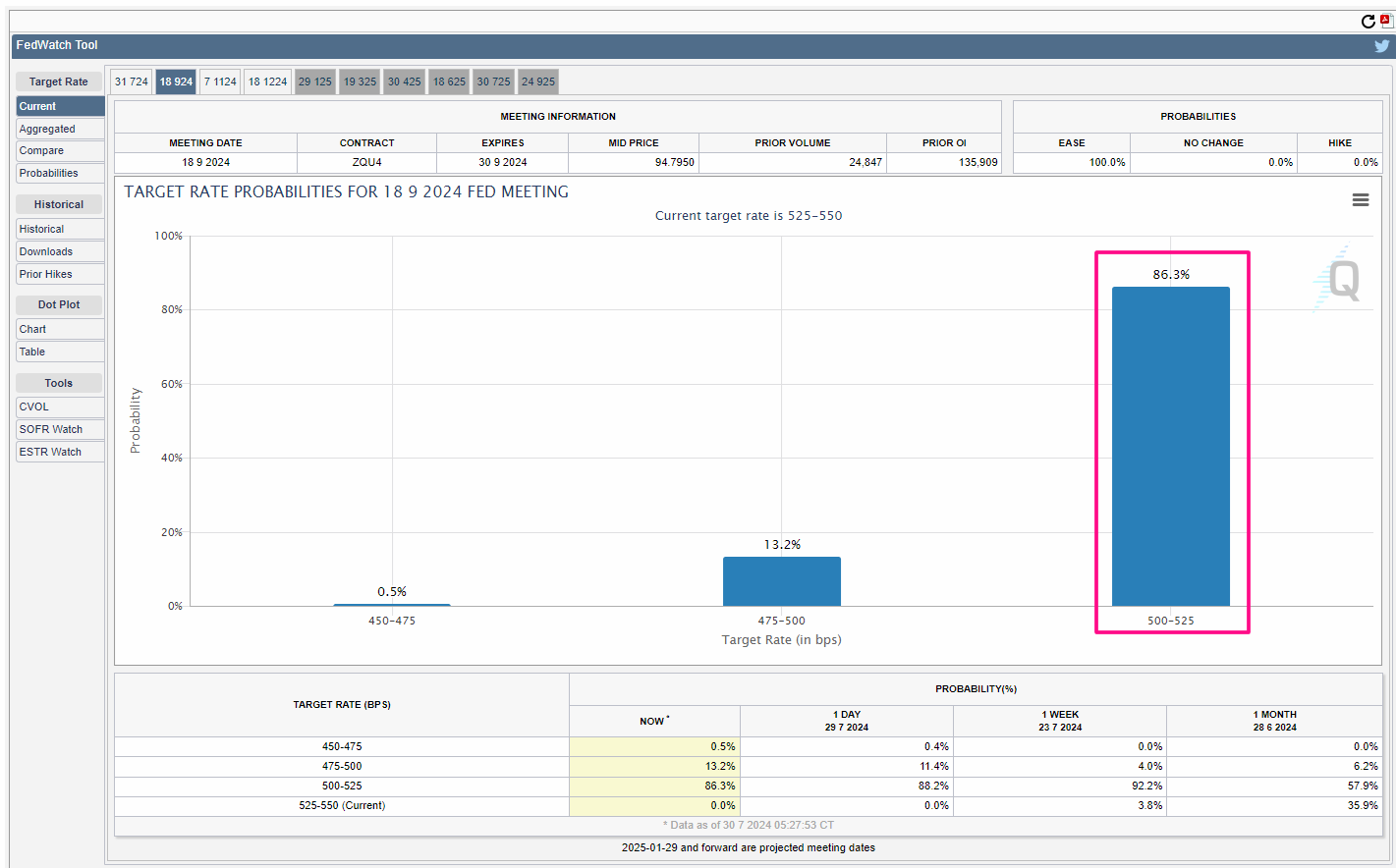 9월 24일에 금리 인하 가능성이 무려 100%에 달합니다. 인하를 덜 할지 더 할지의 문제이지 더 이상 금리동결을 유지할 수 없어 보여요.