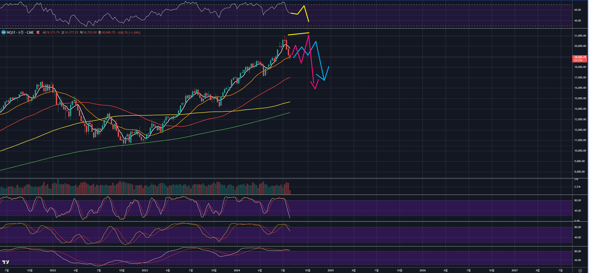 두 타임프레임에서 상승반전을 꾀하는 RSI 일반 상승다이버전스가 나오면서, 24년 7월 11일부터 7월 30일까지 하락하던 나스닥은 반등을 시작할 것이라보이네요. 이것은 고점을 높이는 상승보다는, 데드캣 바운스 성격의 고점을 낮추는 반등이라 여겨집니다.