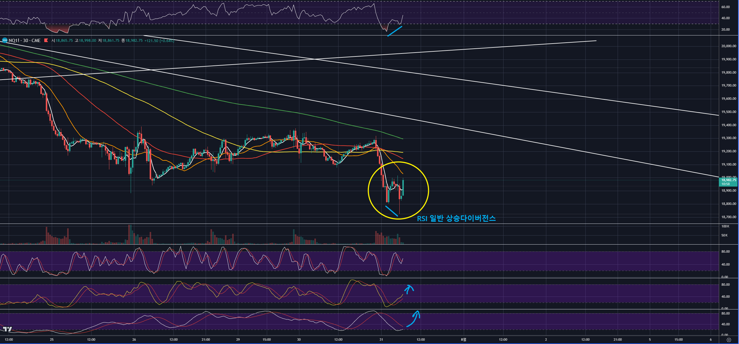 나스닥 30분 봉을 보면, 4시간 봉의 우측 저점에 해당하는 노란색 동그라미 영역에서 다시 조그마한 RSI 일반 상승다이버전스가 나왔습니다.