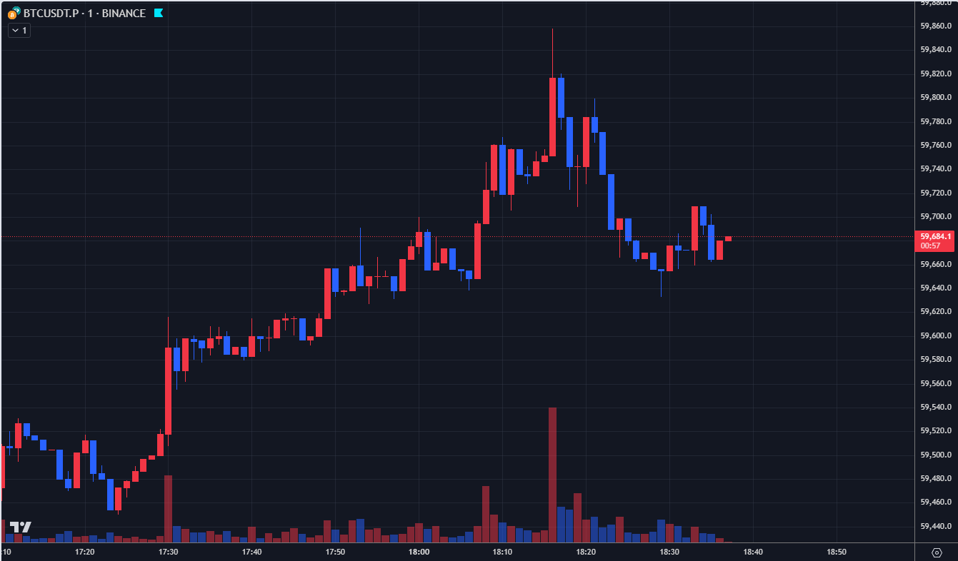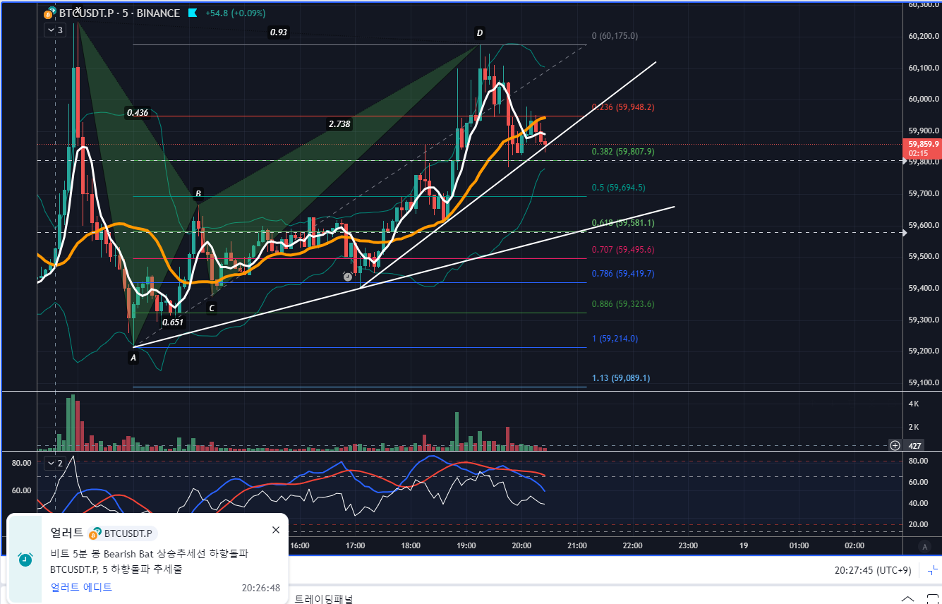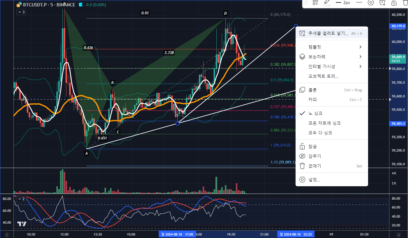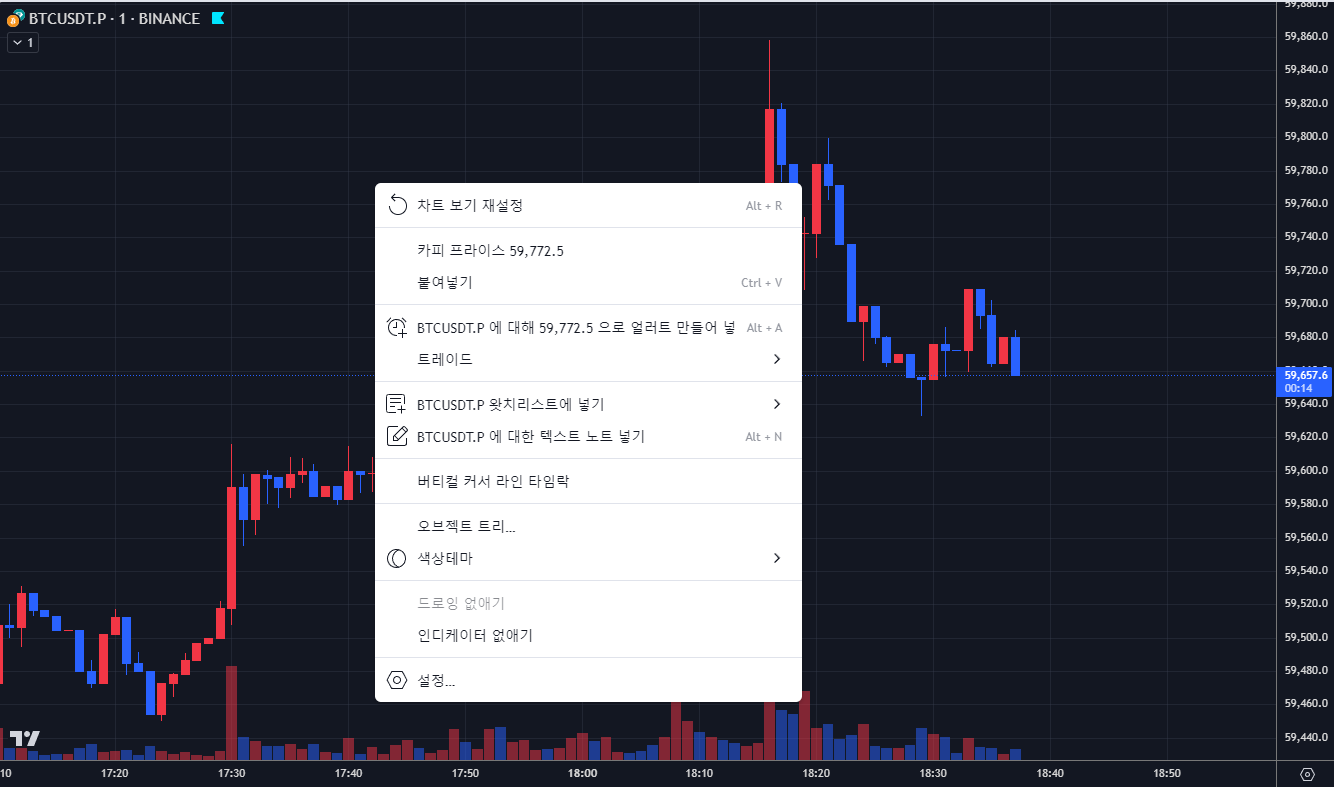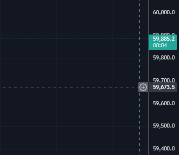 그리고 이 점선을 클릭하면 위 그림과 같이 BTCUSDT.P 돌파 59579.4 X 라고 나옵니다. 여기에서 X표시를 누르면 알람이 삭제됩니다.