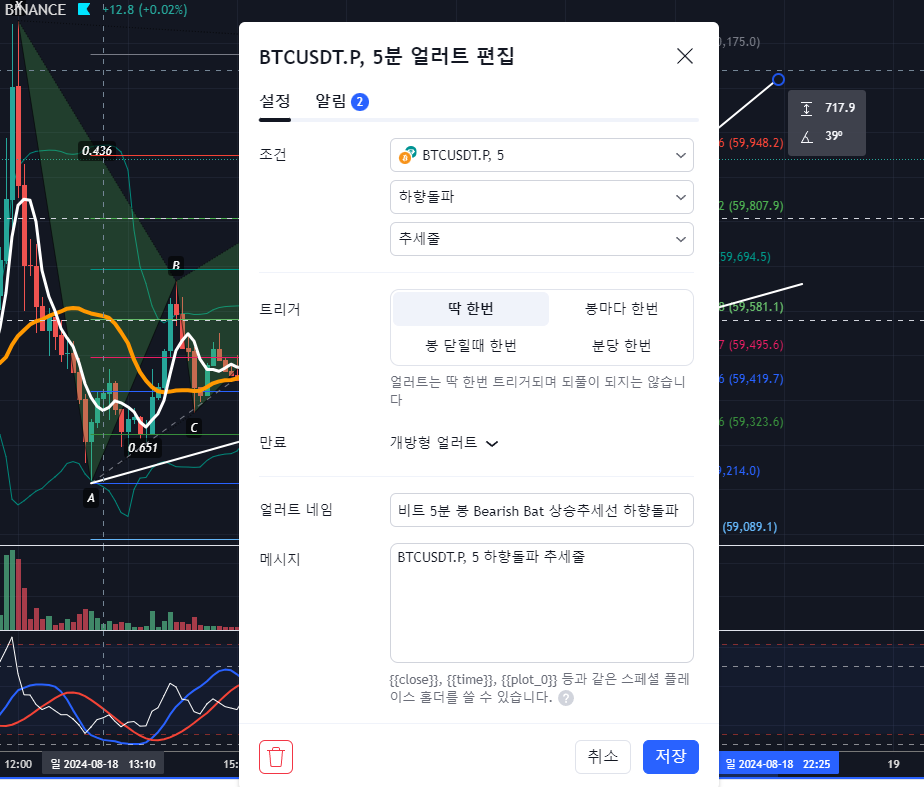 위와 같이 플러스 버튼 설정한 알람의 제목도 변경하여, Bearish Bat TP1 이라고 적으면, 나중에 알람이 올 때 어느 알람이 온지 알 수 있죠.