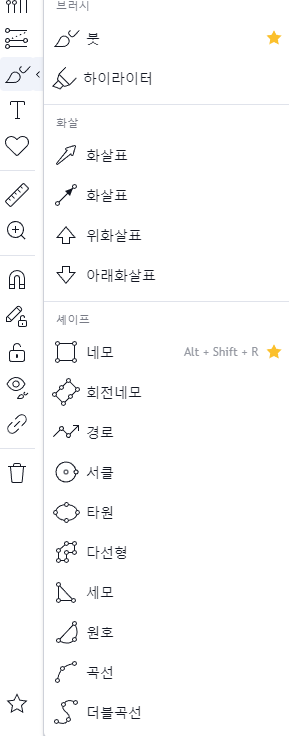 다섯번째 도구모음은 브러시, 화살, 셰이프가 있습니다.