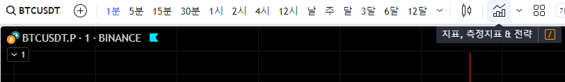 차트의 상단 중앙(그림의 우측)을 보면 꺾은선 그래프와 차트의 모양이 보일 거에요. 이곳에 마우스를 올리면 '지표, 측정지표 & 전략' 가 나와서 지표설정을 할 수 있습니다.