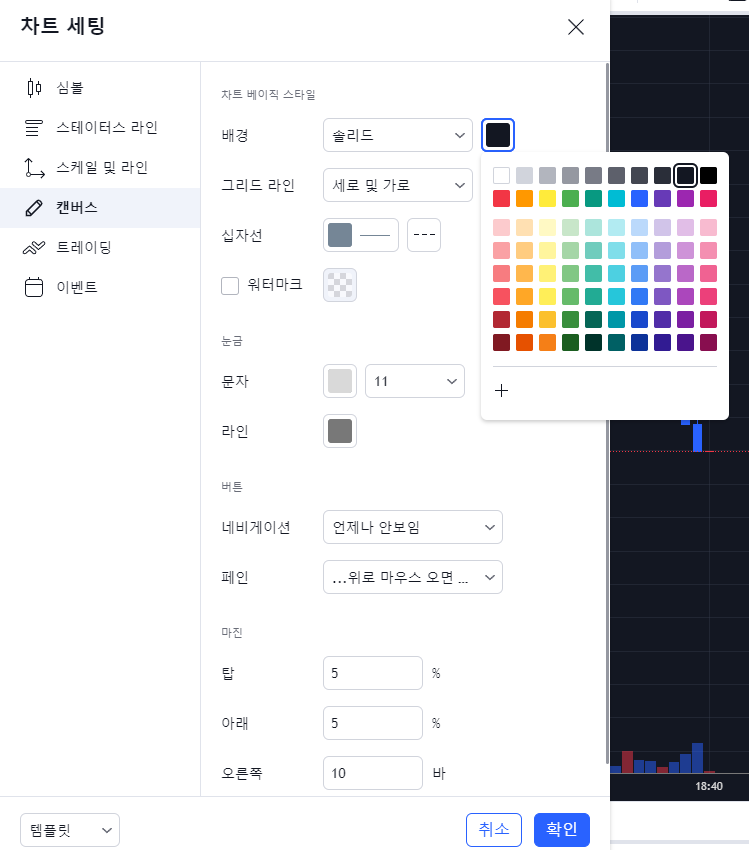 최하단의 설정을 클릭하면 위 그림과 같이 '차트 세팅'이 팝업됩니다. '차트 세팅'에서 '캔버스'를 클릭한 후, '배경'의 색상을 본인이 원하는대로 바꾸시면 됩니다.