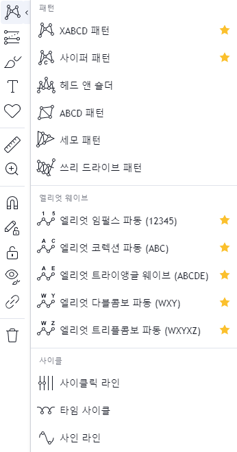 네번째 도구모음을 클릭하면, 패턴과 엘리엇 웨이브, 싸이클 도구를 확인할 수 있습니다.