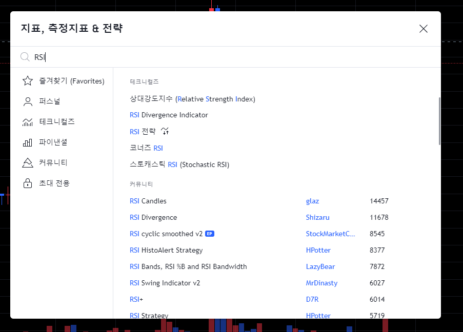 돋보기 모양의 검색란에 'RSI'를 검색하면 상대강도지수인 RSI를 설정할 수 있어요.