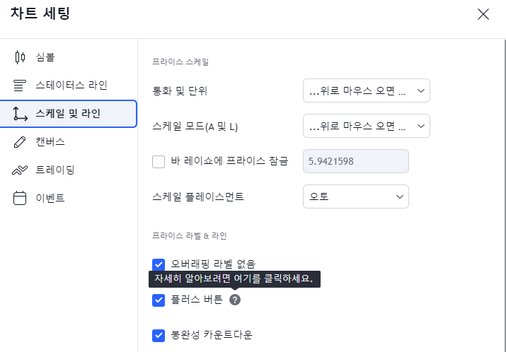 차트의 배경에서 설정을 누르면 '차트 세팅'에 접근 가능하며, '스케일 및 라인'에서 '플러스 버튼'을 누르면 활성화됩니다.