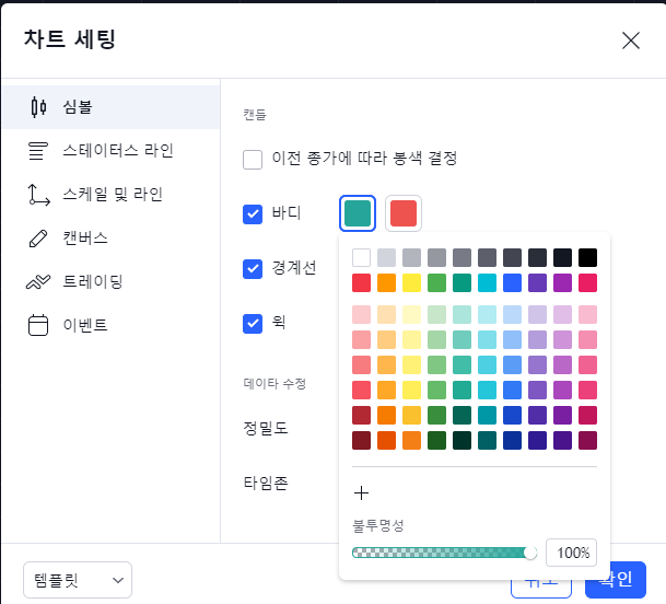 캔들을 더블클릭 하시면, 위의 캡쳐화면과 같이 '차트 세팅'에 접근 가능합니다.