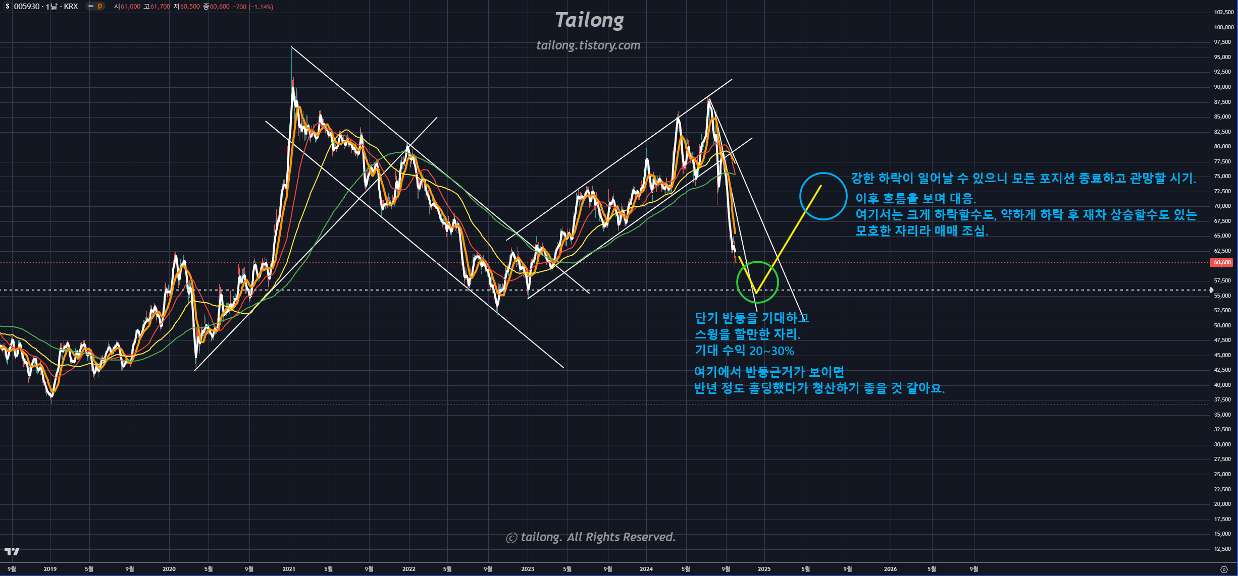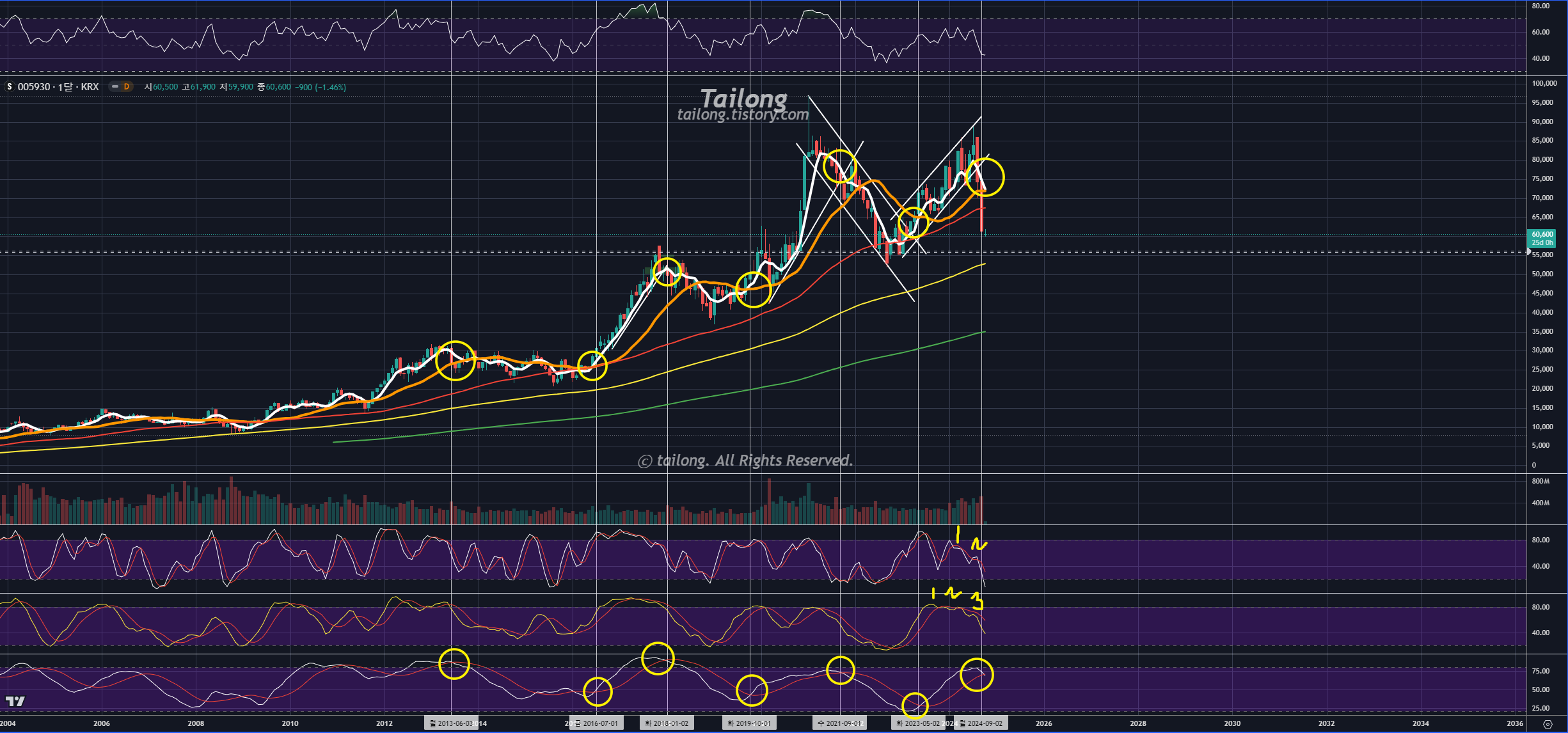 위 차트는 삼성전자 주봉 차트입니다. 노란 동그라미 위치가 이전 24년 1월 게시글 업로드 시기네요.