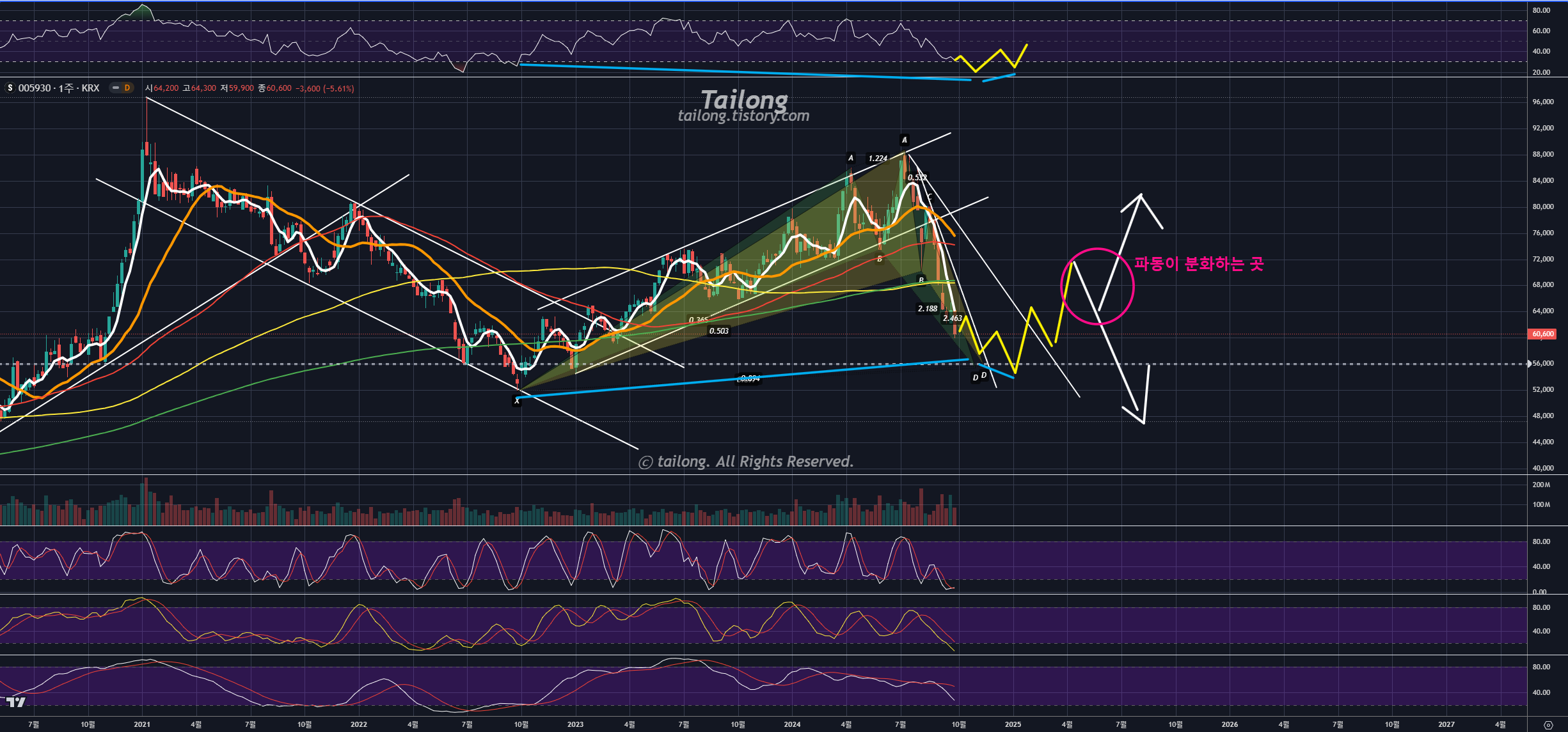 이렇게 된다면 삼성전자는 주봉상 Bullish Shark, Bullish Bat, RSI 히든+일반 상승다이버전스 조합으로 강한 반등을 할 것 같아요.