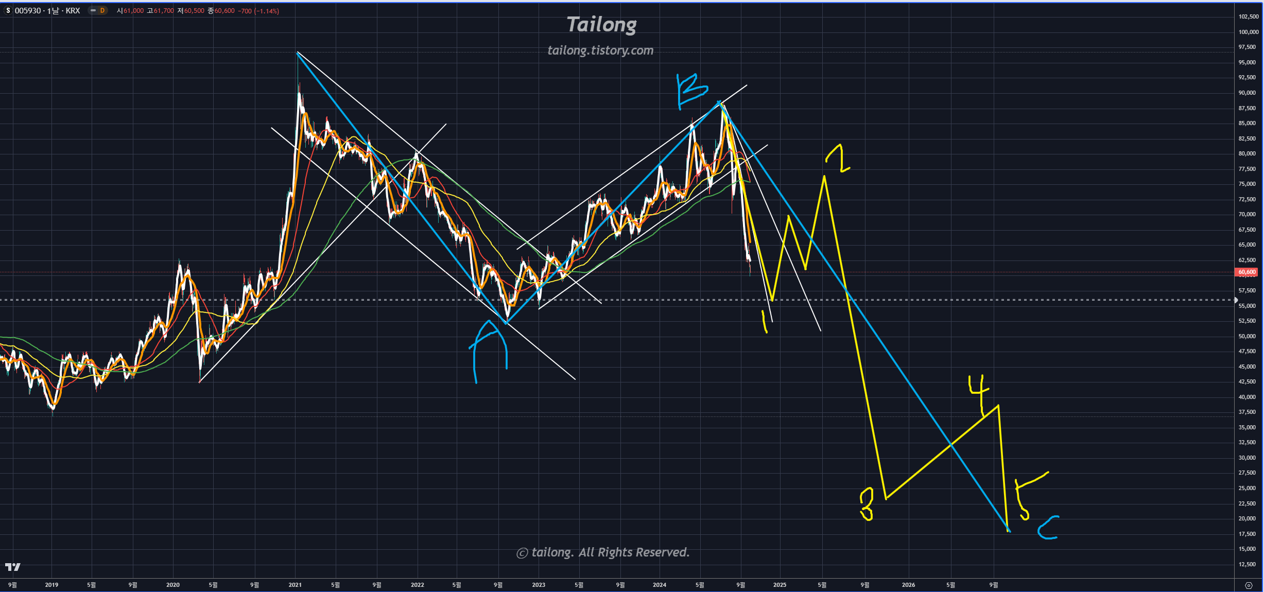 24년 1월에 봤던 관점으로는 계속 하락해서 3만원 전후까지 하락하는 시나리오가 그대로 진행 중이라면,