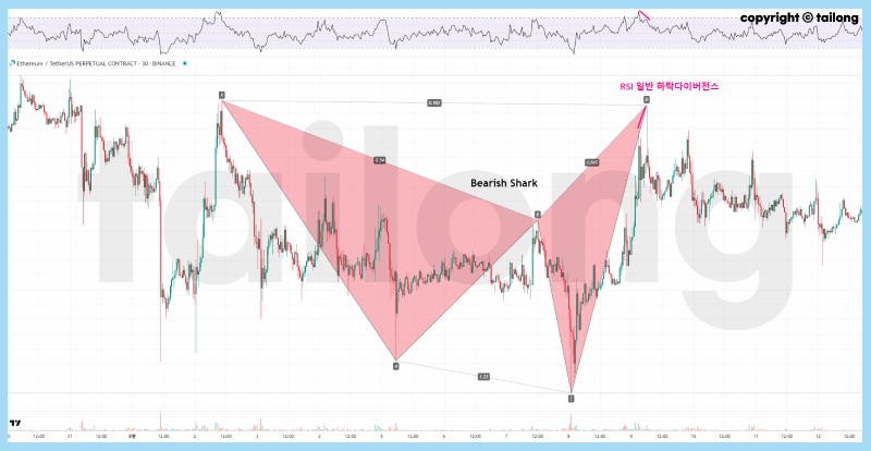 위 차트는 이더리움 30분 봉 Bearish Shark Pattern With RSI 일반 하락다이버전스 첫 번째 예시입니다.
